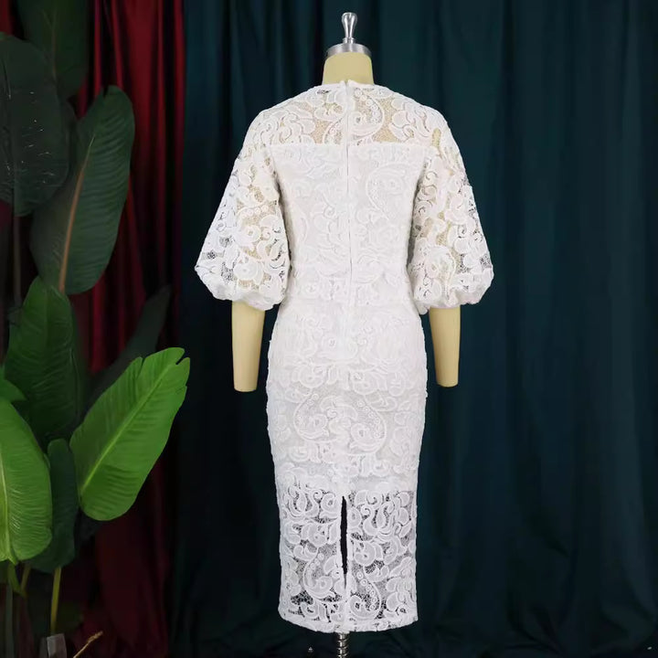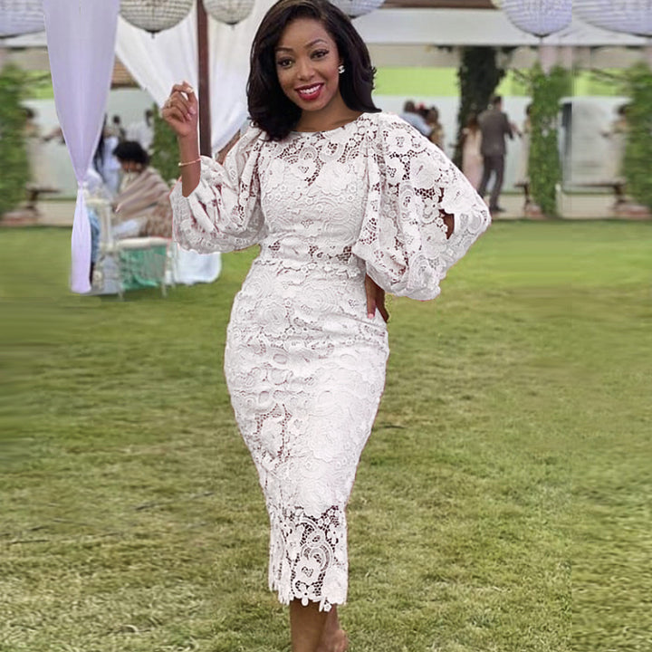 Lace hollow lantern sleeves long sleeves high waist banquet evening dress medium and long dress women's party dress