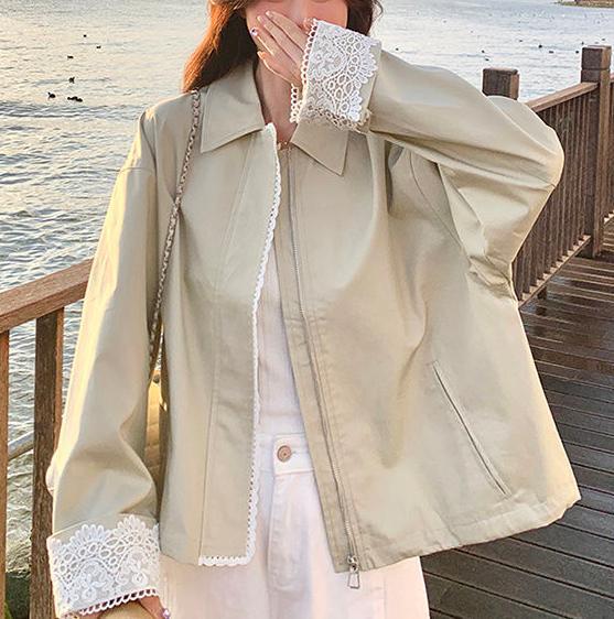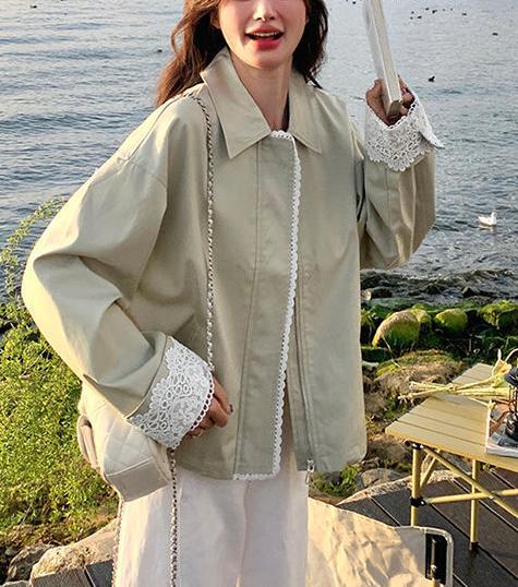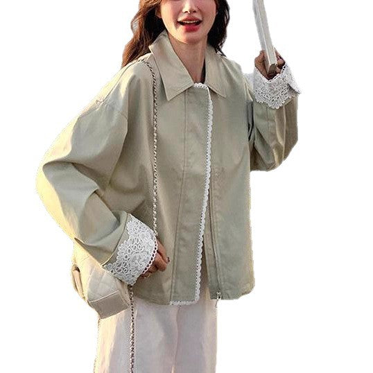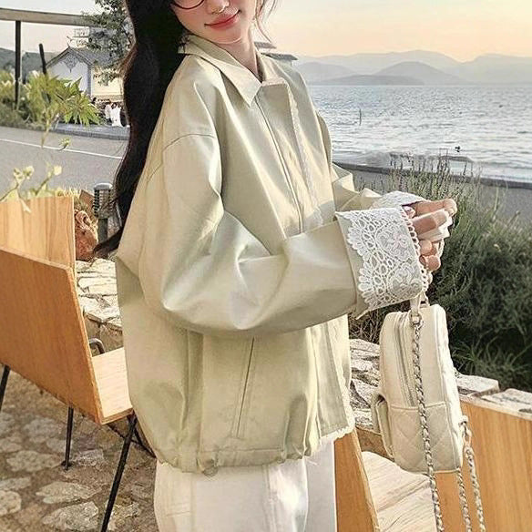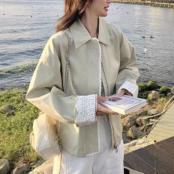 Lace splicing lapel long-sleeved jacket jacket women's new short design baseball jersey top trendy spring and autumn women's clothing