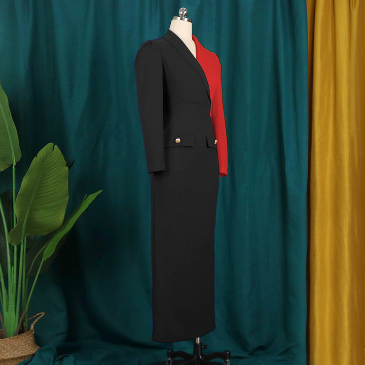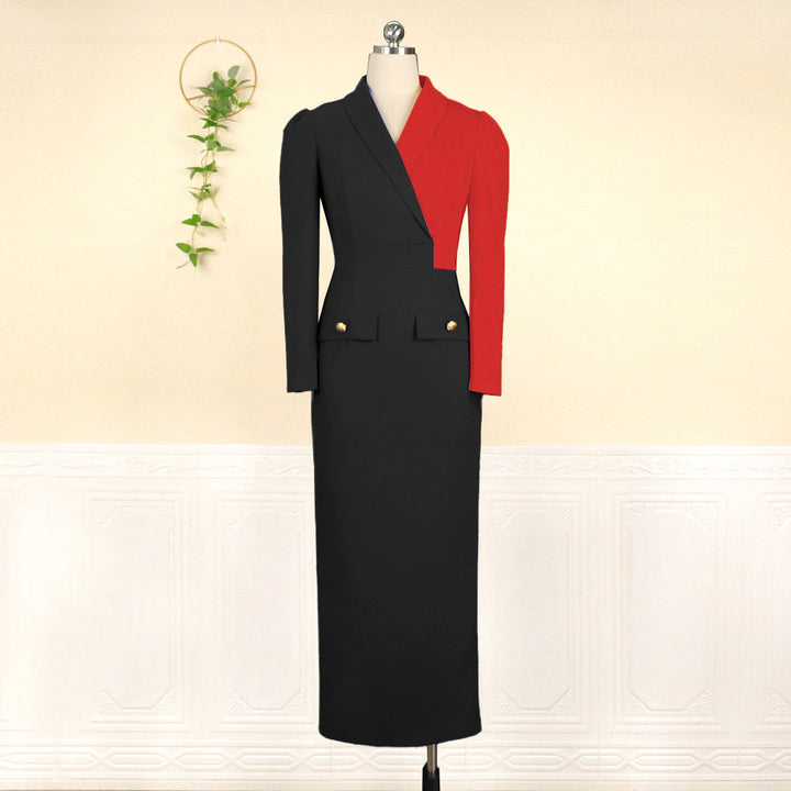 Lapel long sleeve splicing contrasting buttons decoration high waist performance clothing, women's dress party dress