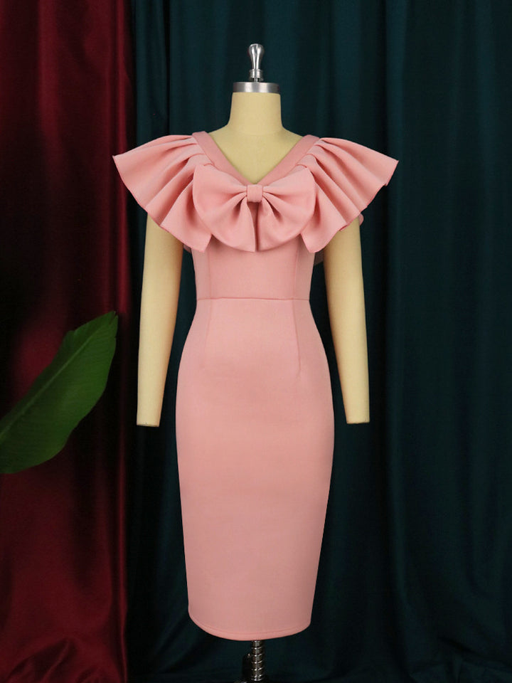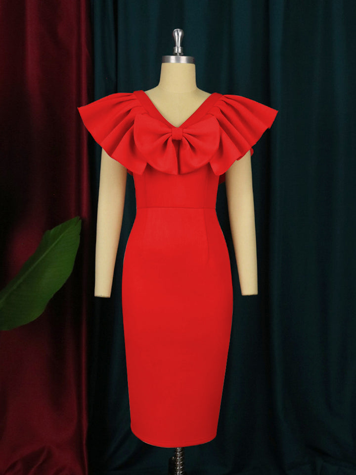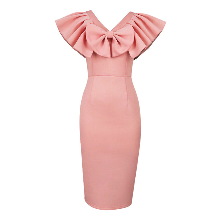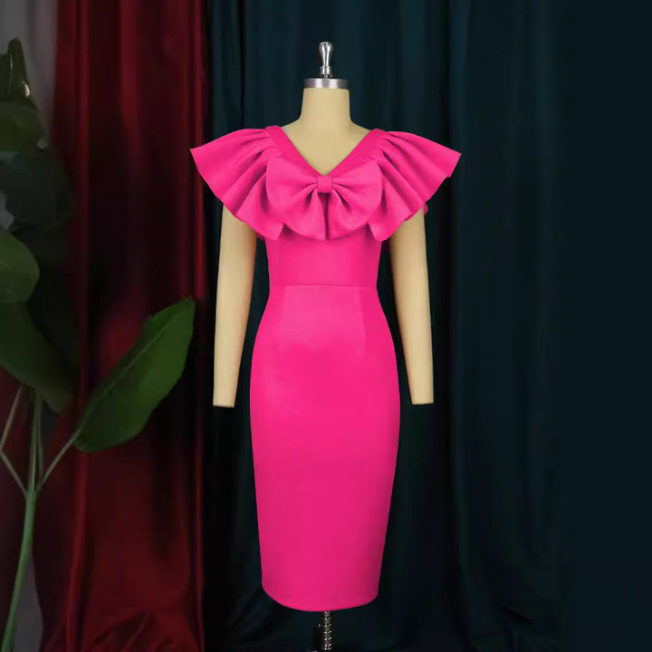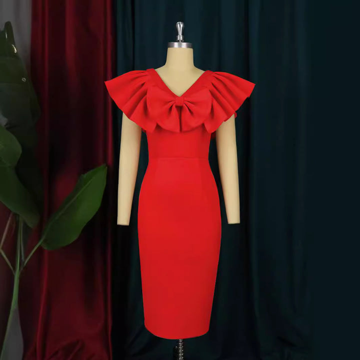 Large size new temperament bow V-neck lotus leaf sleeve high waist hip skirt banquet dress dress women's dresses