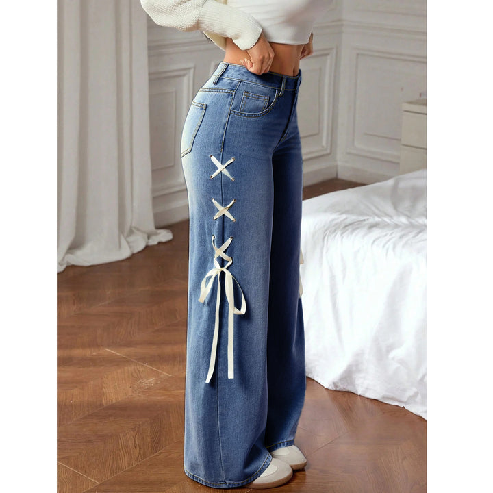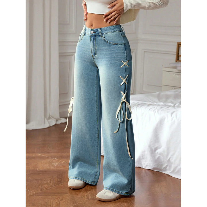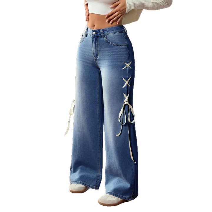 Large size women's clothing, side ribbon straps, straight loose, jeans, washed elastic denim, fashionable and sweet.