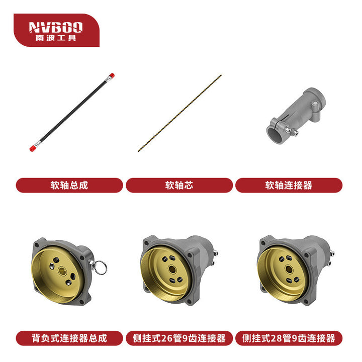 Knapsack rod, Knapsack rod (with handle baffle), side-mounted rod, Side-mounted rod (with switch), Side-mounted rod (with switch strap baffle), Side hanging the full set, 1 high-quality flexible shaft assembly, (Flexible shaft assembly + flexible shaft core) 1 group, (Flexible shaft assembly + connecting pipe) 1 group, (Flexible shaft assembly + flexible shaft core + connecting pipe) 1 group, 1 high-quality flexible shaft core, 3 high-quality flexible shaft cores, 5 high-quality flexible shaft cores, 1 hose connecting pipe, Side-mounted shoulder strap, Backpack double shoulder strap, Knapsack connector assembly, Side-mounted 26-tube 9-tooth connector, Side-mounted 28-tube 9-tooth connector, Knapsack handle, Buffer carrying handle, 26 tube holder, 28 tube holder, Knapsack rod (without flexible shaft) |