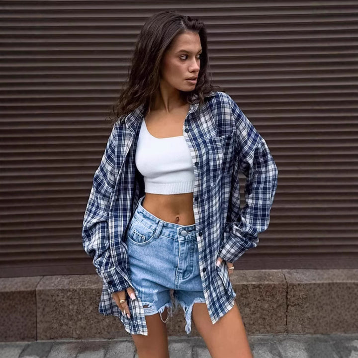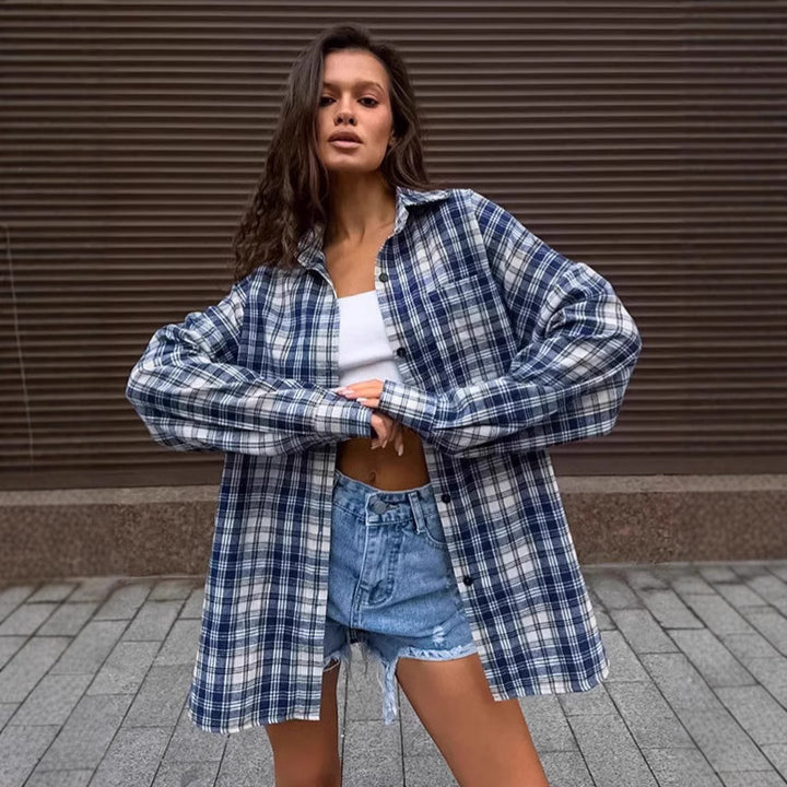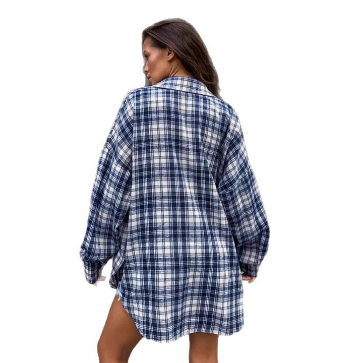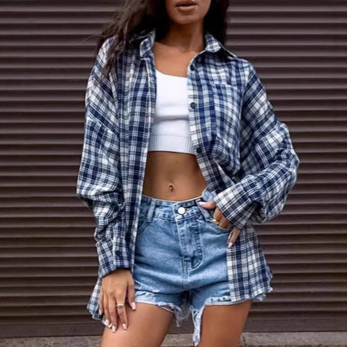 Lazy casual American blue plaid shirt women's spring and summer design sense loose outer shirt cardigan European and American women's clothing