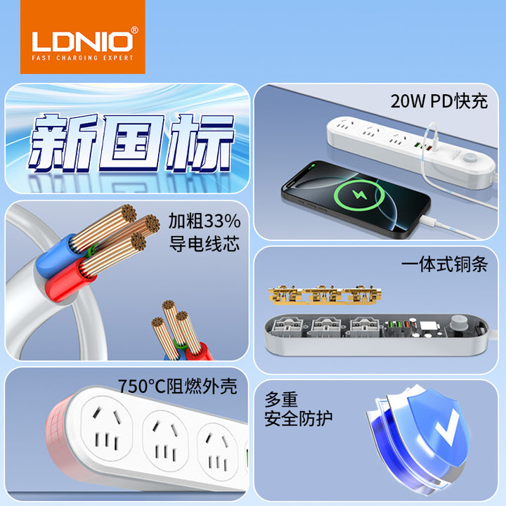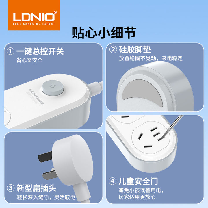 LDNIO household high-power socket with cable, two-foot triangle medium gauge desktop fast charging power strip wiring socket 3C