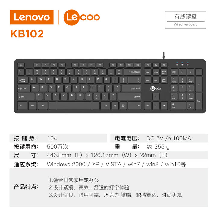 Lecoo KB102 Wired Keyboard Chocolate Business Office Home Laptop Desktop USB Pass