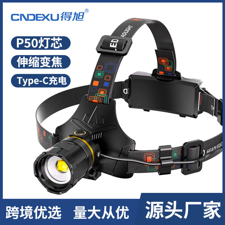LED strong light headlight P50 retractable zoom USB charging, outdoor waterproof fishing camping household head-mounted flashlight
