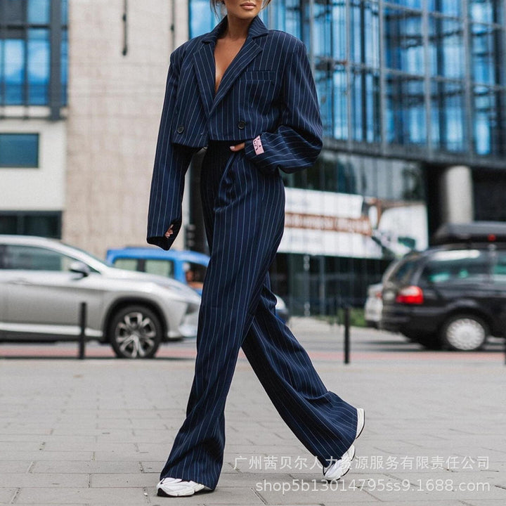 LZR17414 New dark blue striped short lapel suit straight-leg pants set (2-piece set)