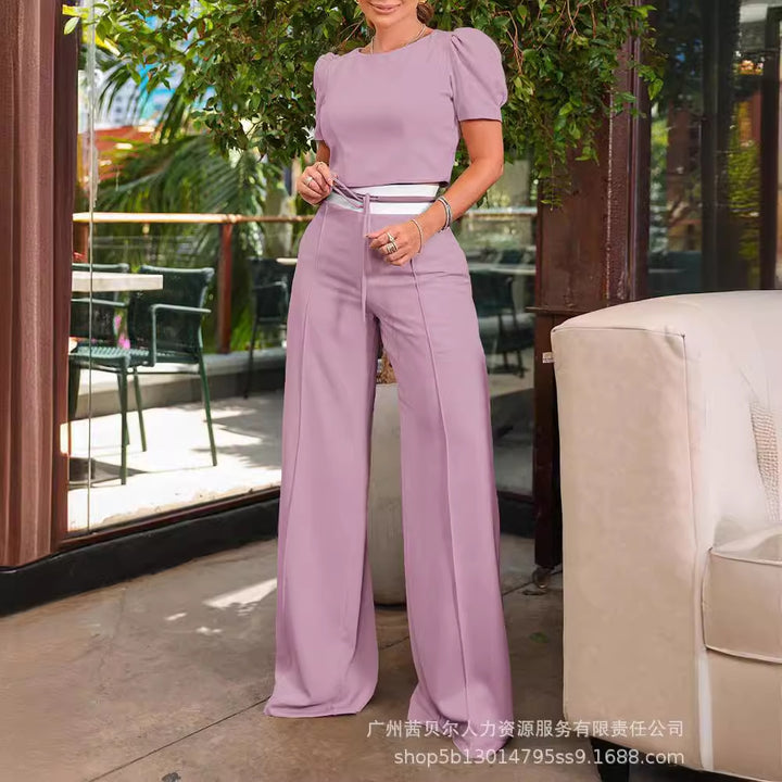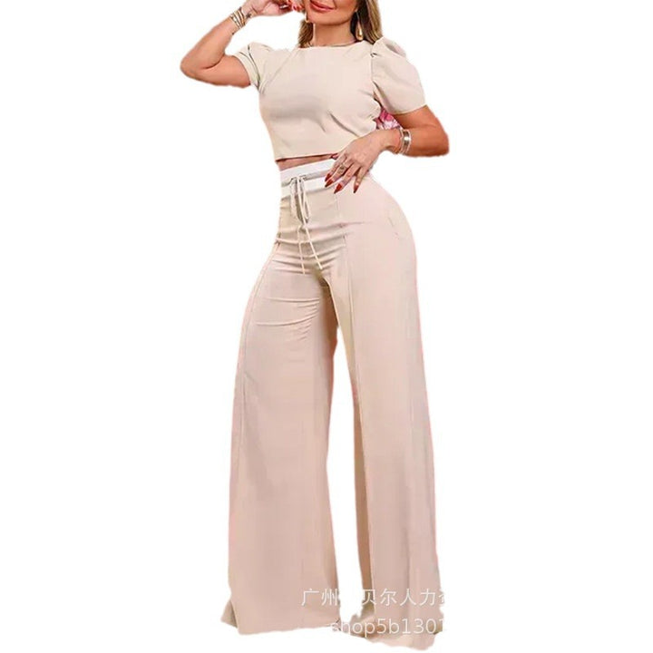 LZR18079 New 2024 apricot short-sleeved top set, threaded splicing wide-leg trousers 2-piece set