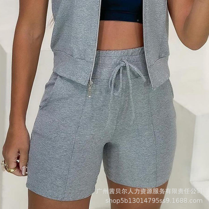 LZR18238 New 2024 Women's Grey Sleeveless Patch Bag Cardigan Jacket Set Shorts (2-piece set)