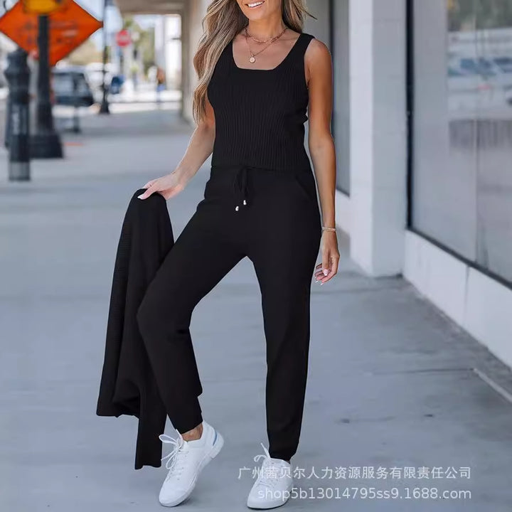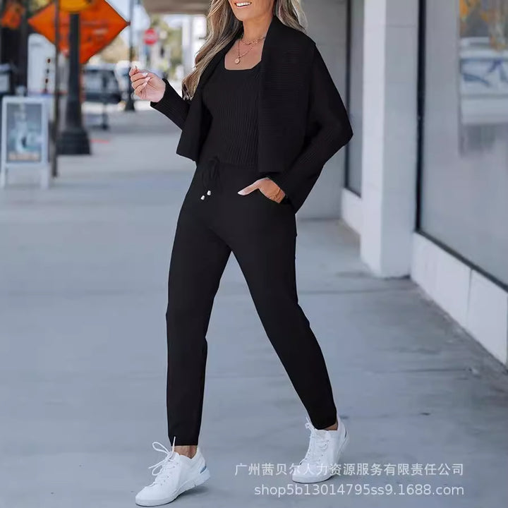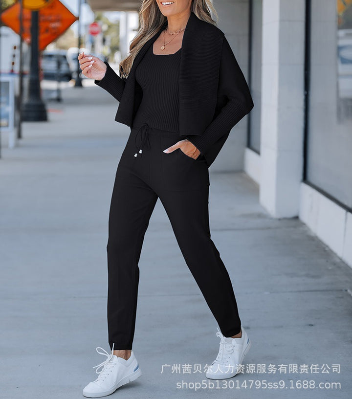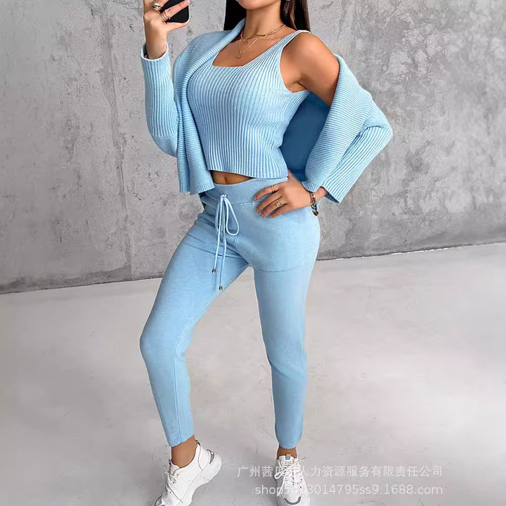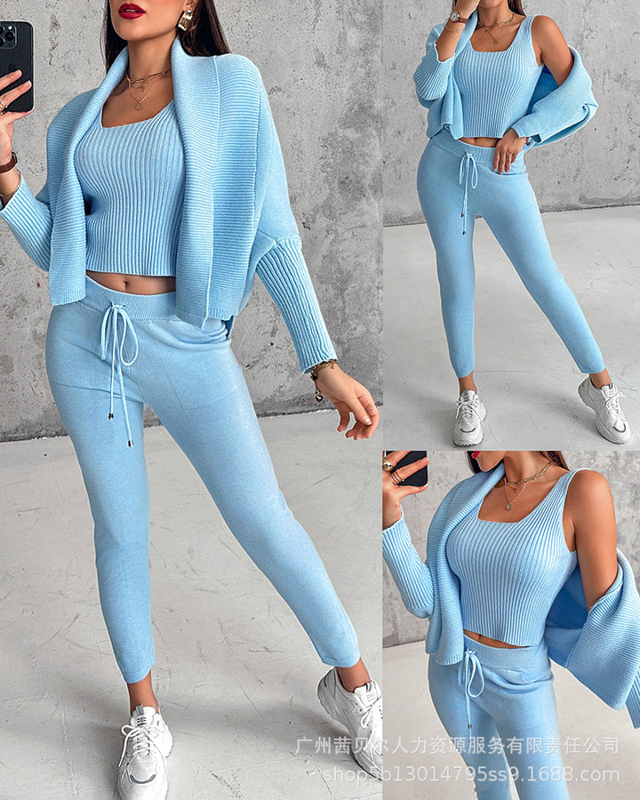 LZR18759 European and American light blue lapel bat sleeve cardigan suspender vest low waist strap knitted three-piece set