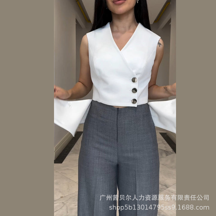 LZR18797 European and American sleeveless cardigan top vest + waist color matching flanged design casual straight-leg pants 2 sets