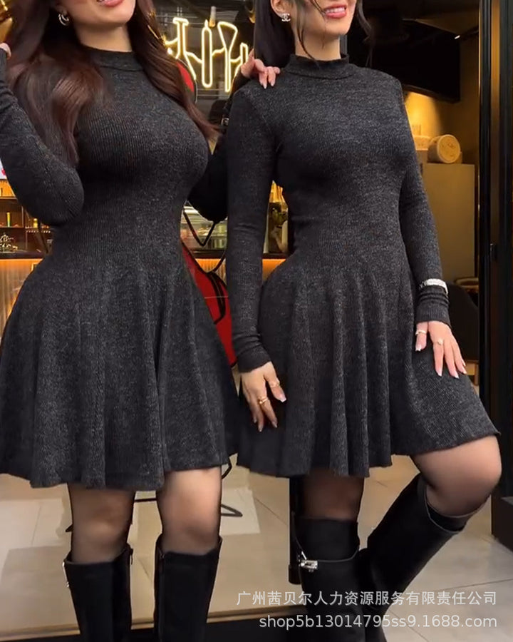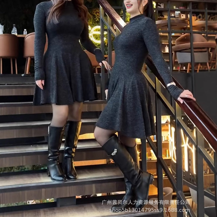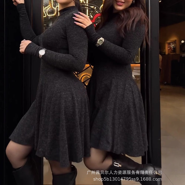 LZR19108 European and American black threaded double grinding long-sleeved high-waisted waist flared skirt