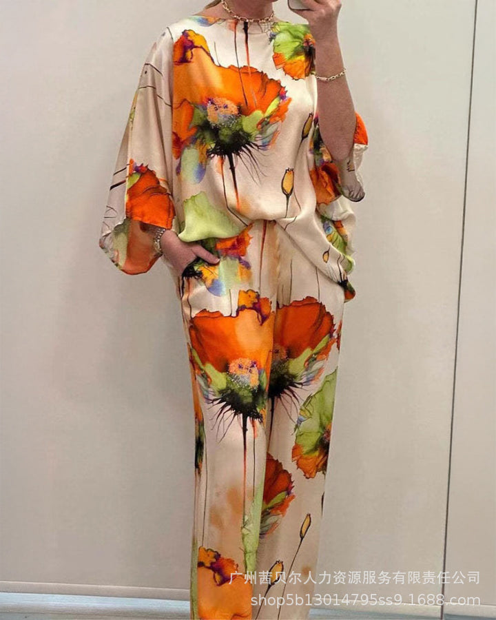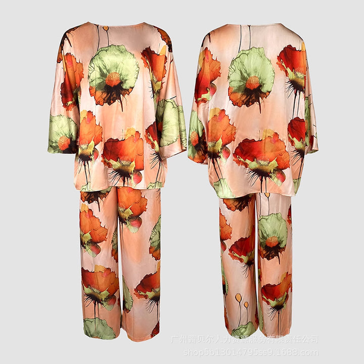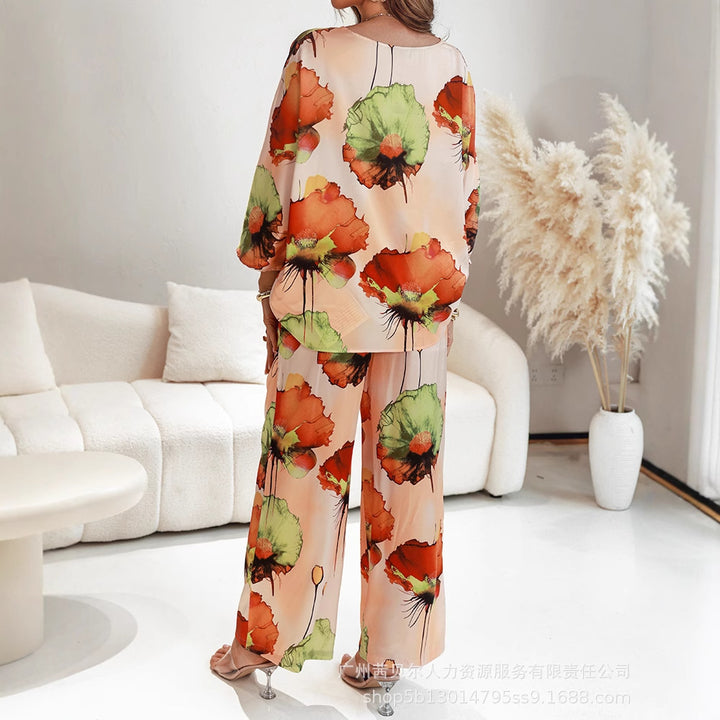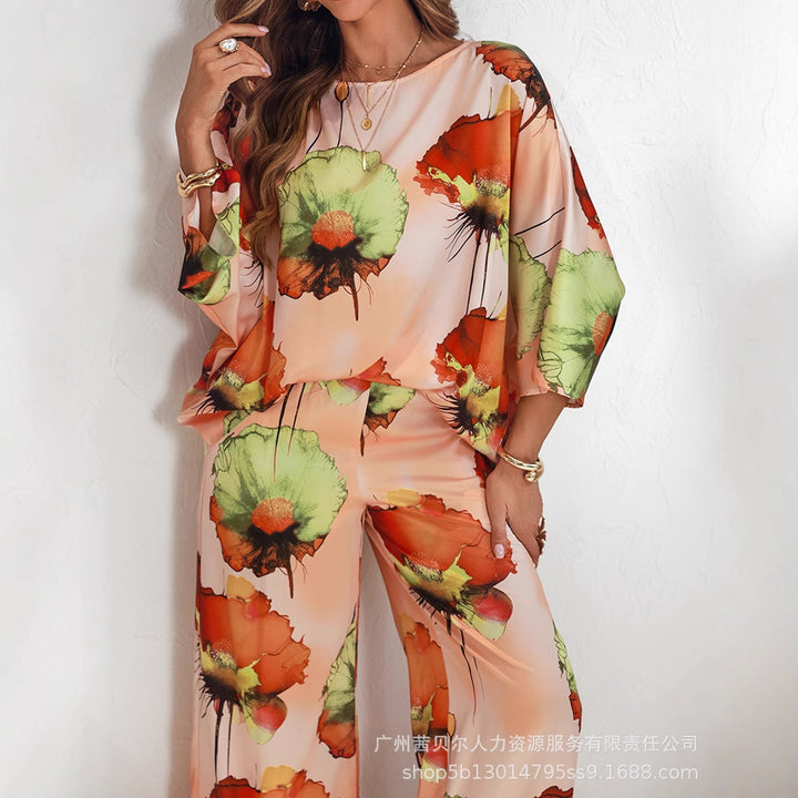 LZR19300A Women's Fashion Bat Sleeve Top + Elastic Waist Wide Leg Pants Set