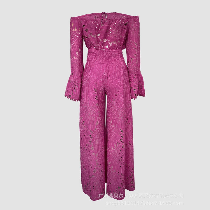 LZR19475 rose red one-word shoulder strap loose flared sleeve top set trouser leg flared pants set