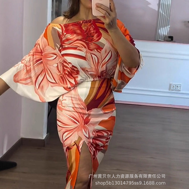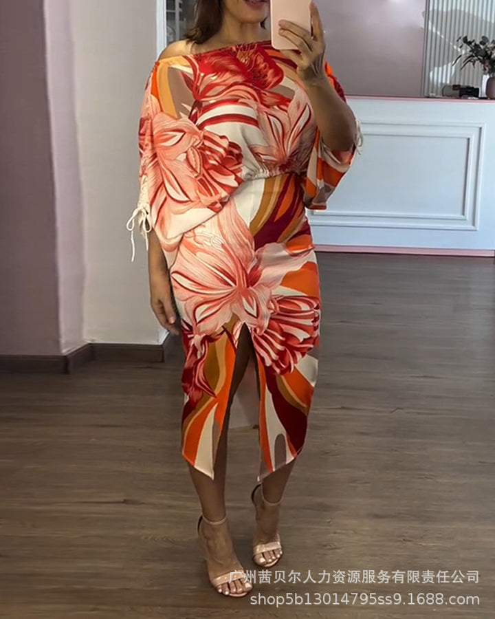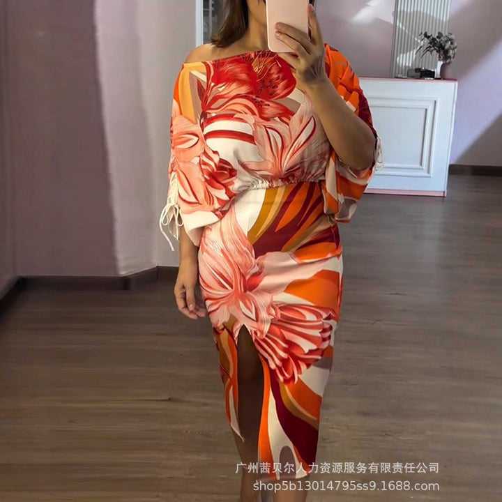 LZR19646 Women's Flower Sleeve Side Drawstring Design Loose Short Top Hip Wrap Test Split Fork Mid-skirt Set