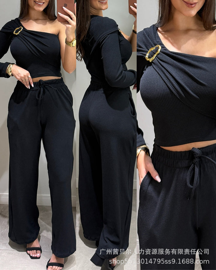 LZR19655 New Short Shoulder Metal Accessories Decorative Long Sleeve Top Set Wide Leg Pants Set