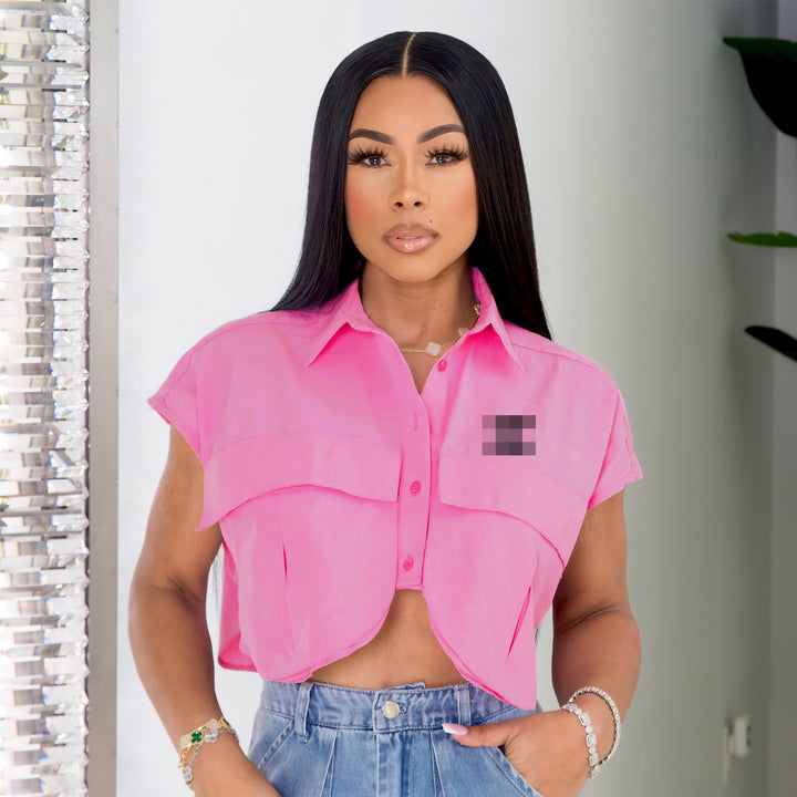 M3020G European and American women's solid color pocket splicing irregular single-breasted cardigan shirt top
