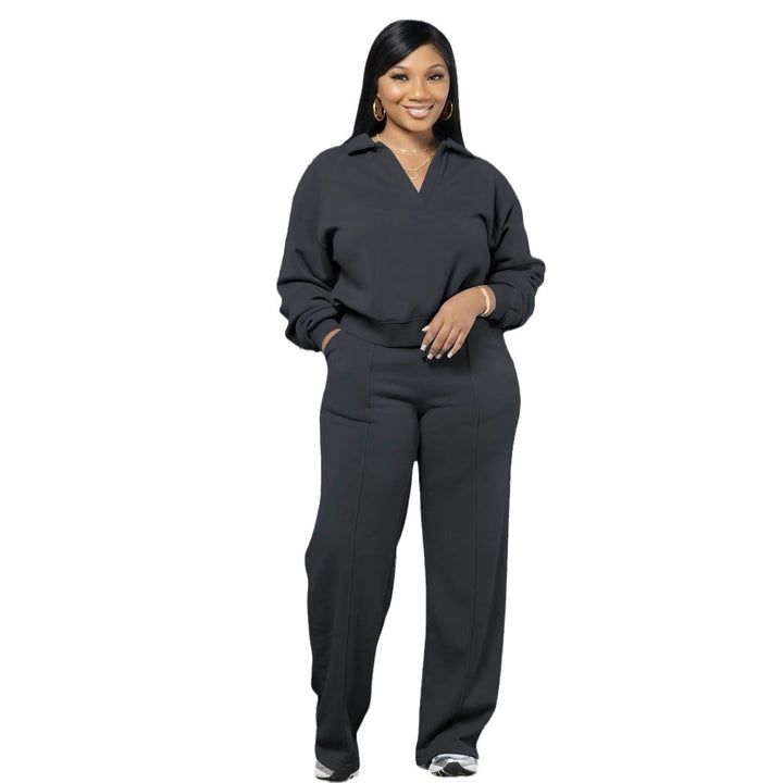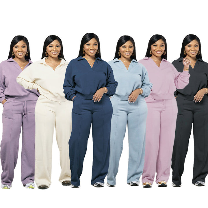 M3069 European and American autumn and winter solid color flip V-neck pullover long-sleeved women's fashion casual sports sweater set