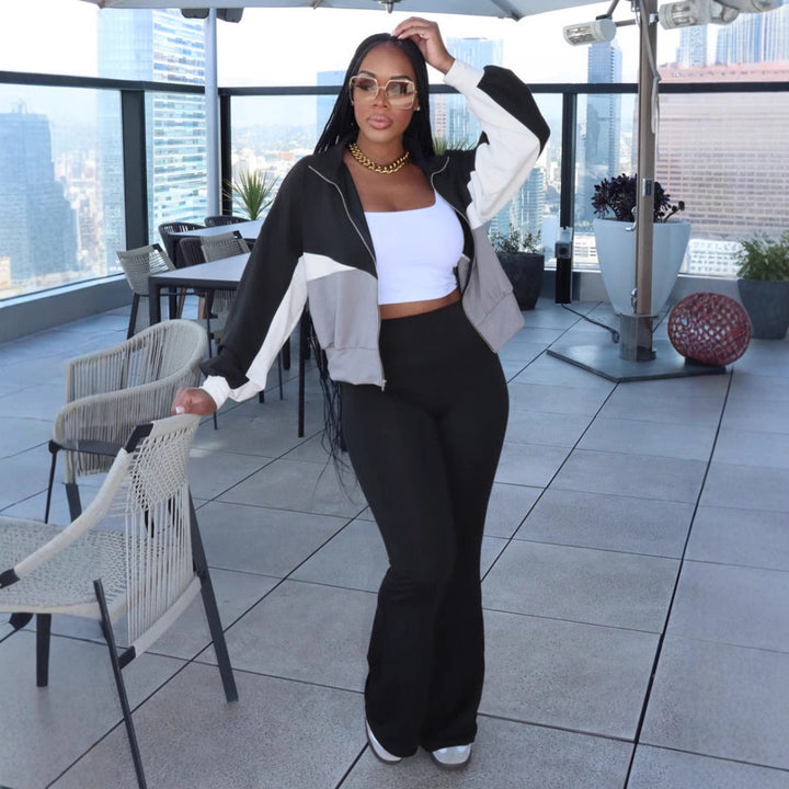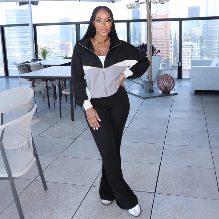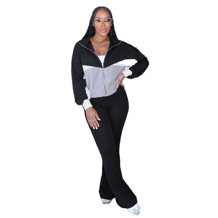 M3070 European and American autumn and winter women's clothing two-piece set long-sleeved zipper jacket tight flared pants set