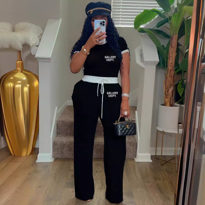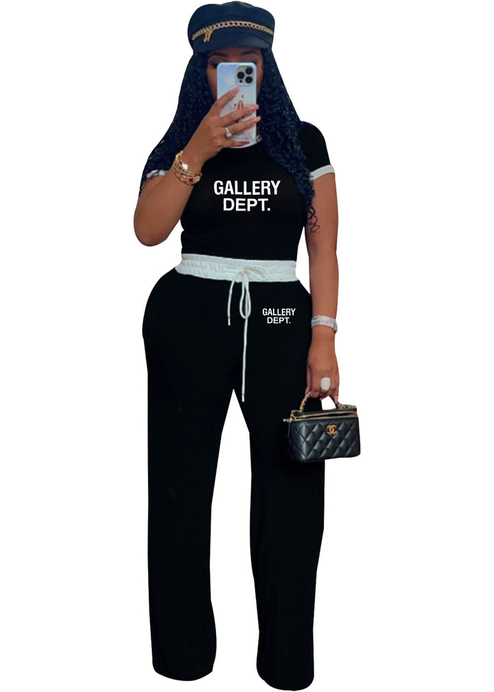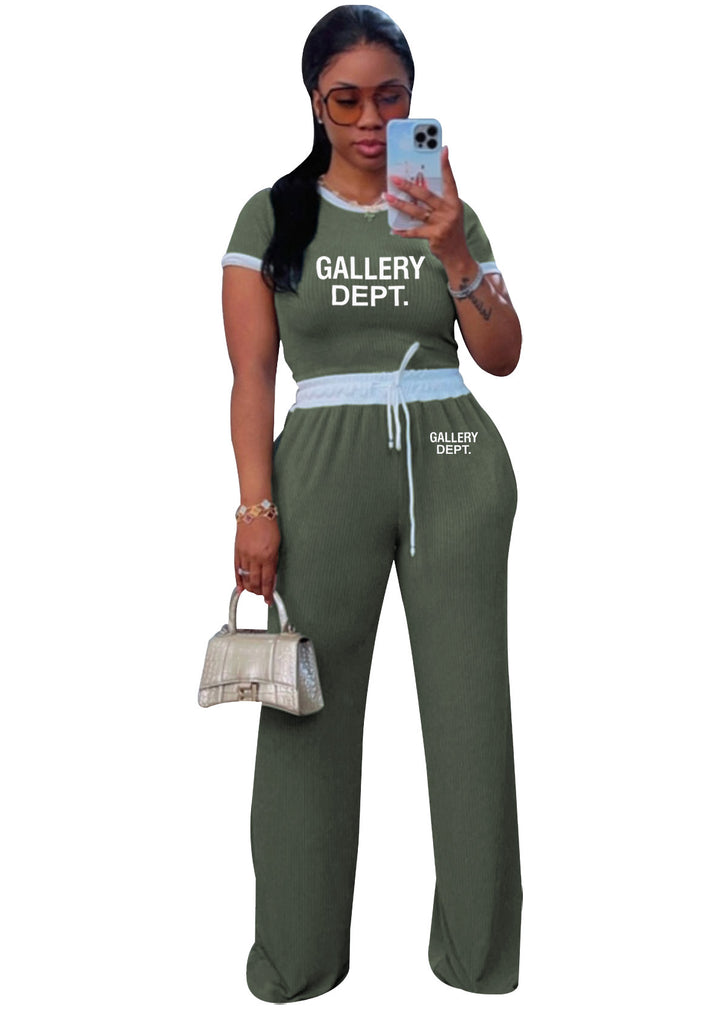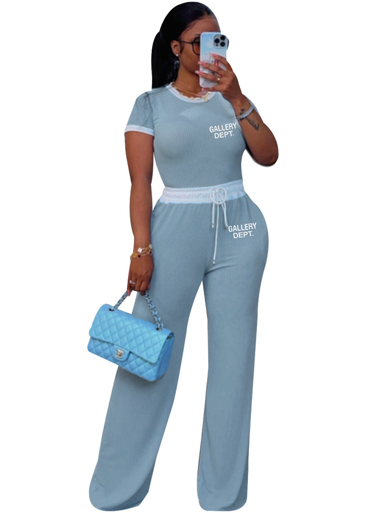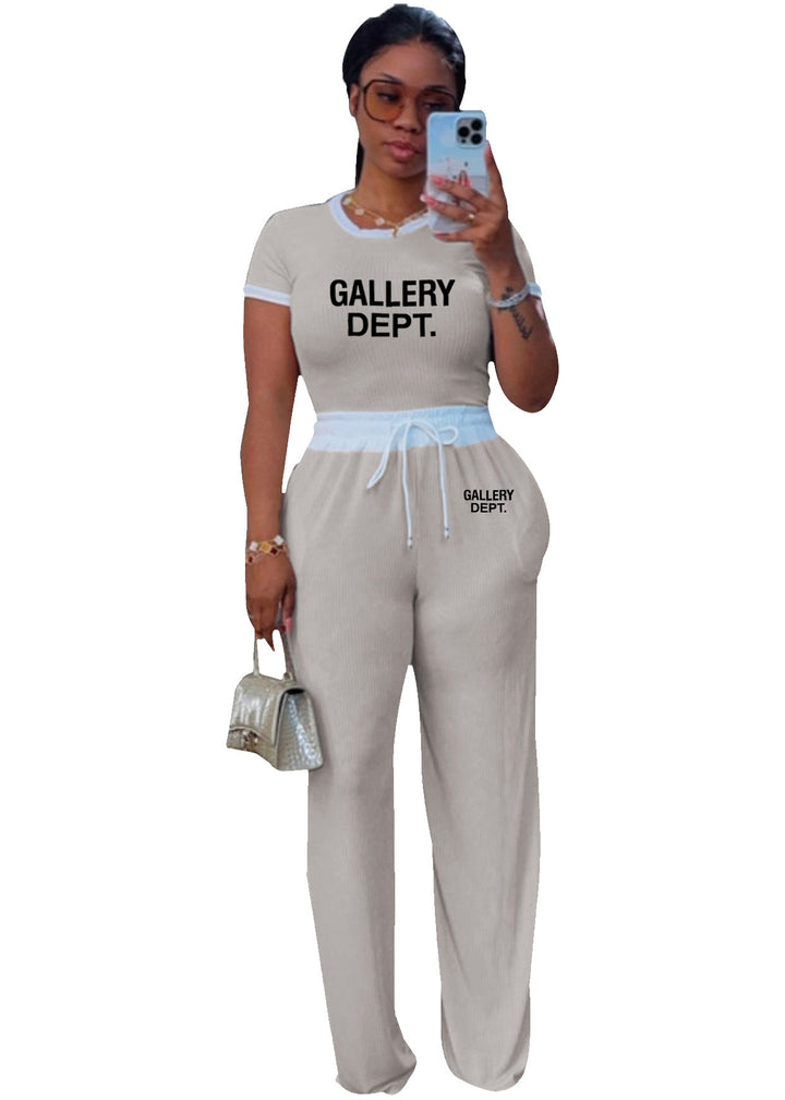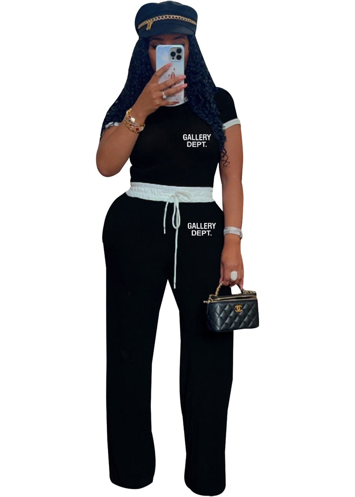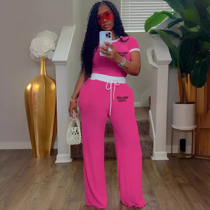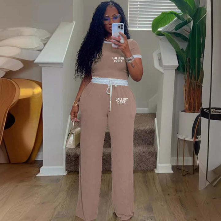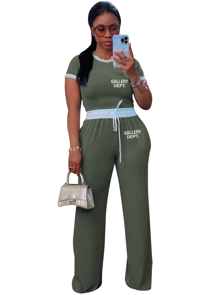 M3152D European and American women's clothing casual street daily rib contrasting color round neck short-sleeved pants set of two pieces