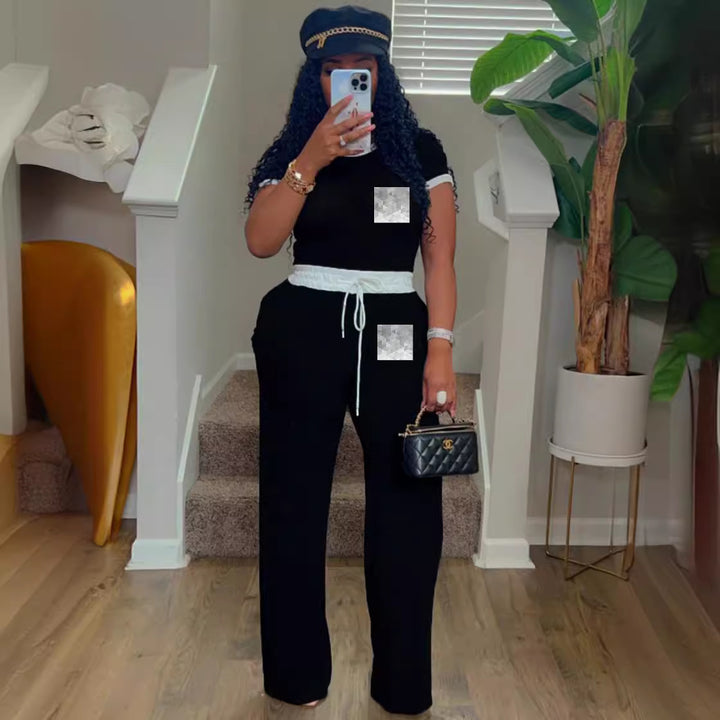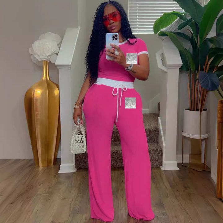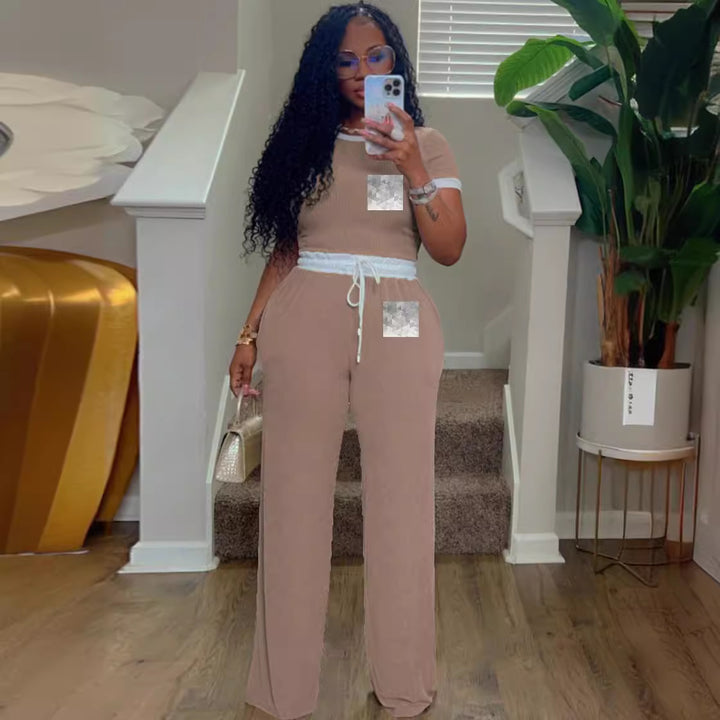 M3152G European and American women's clothing casual street daily rib contrasting color round neck short-sleeved pants set of two pieces