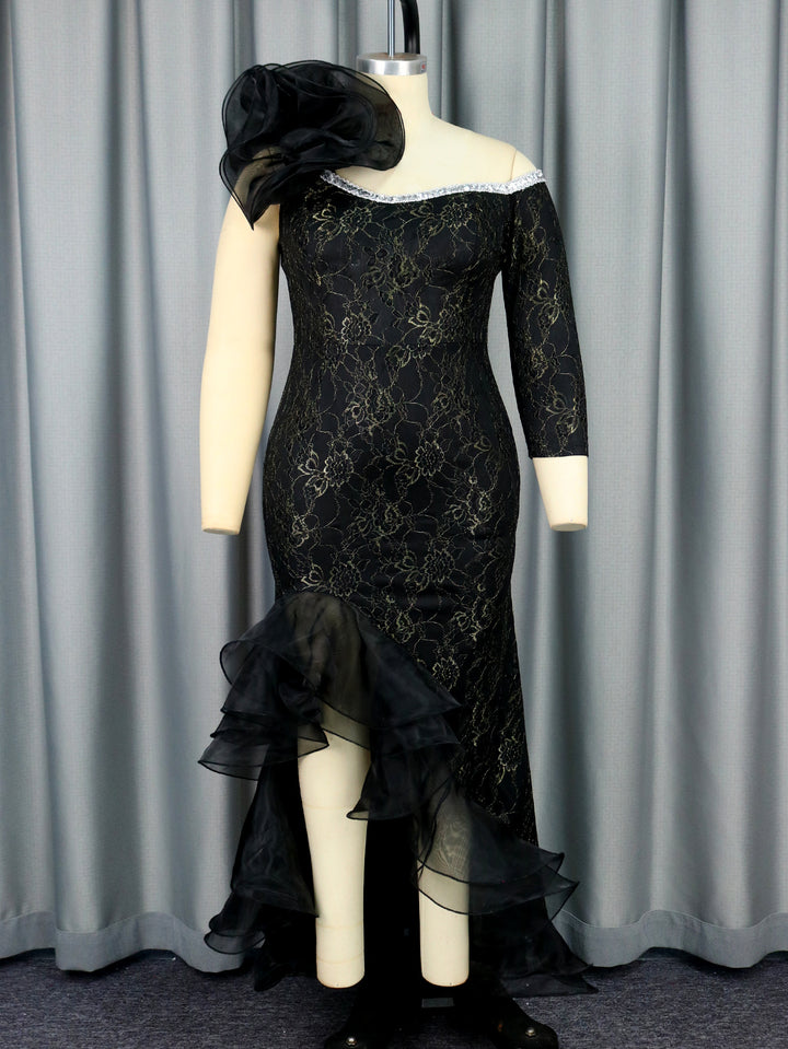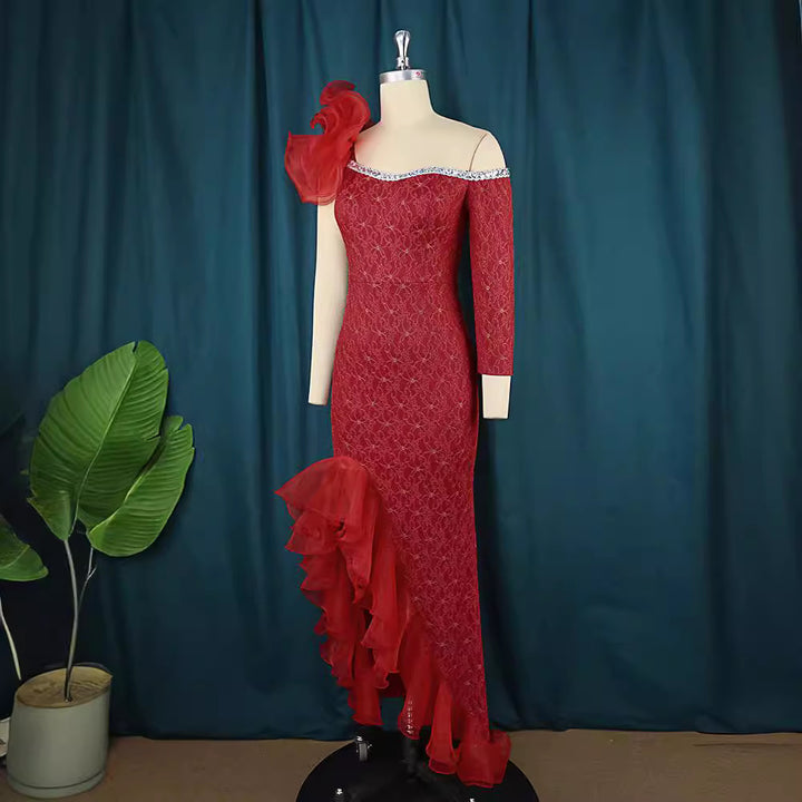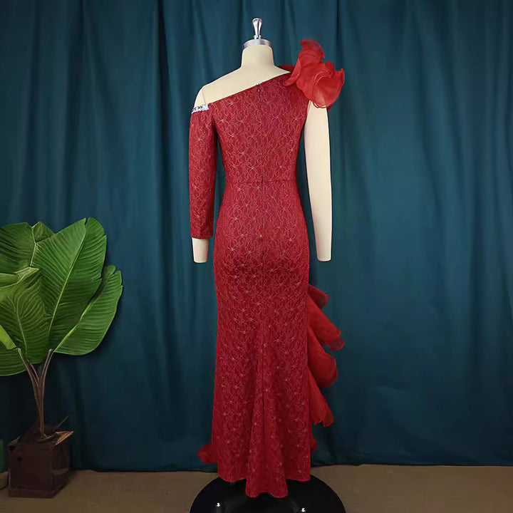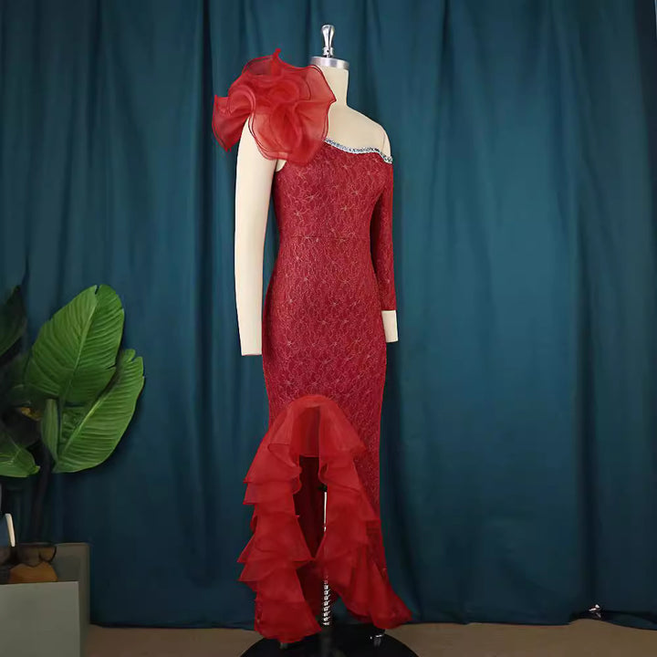 Mesh splicing diagonal collar dress long dress, designer single-sleeved diagonal pendulum fungus edge dress party dress