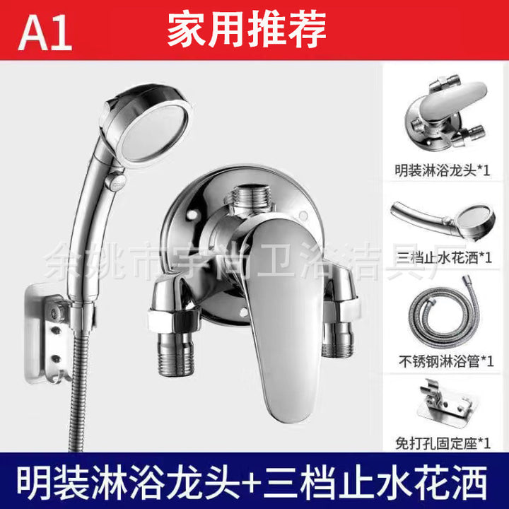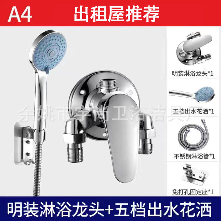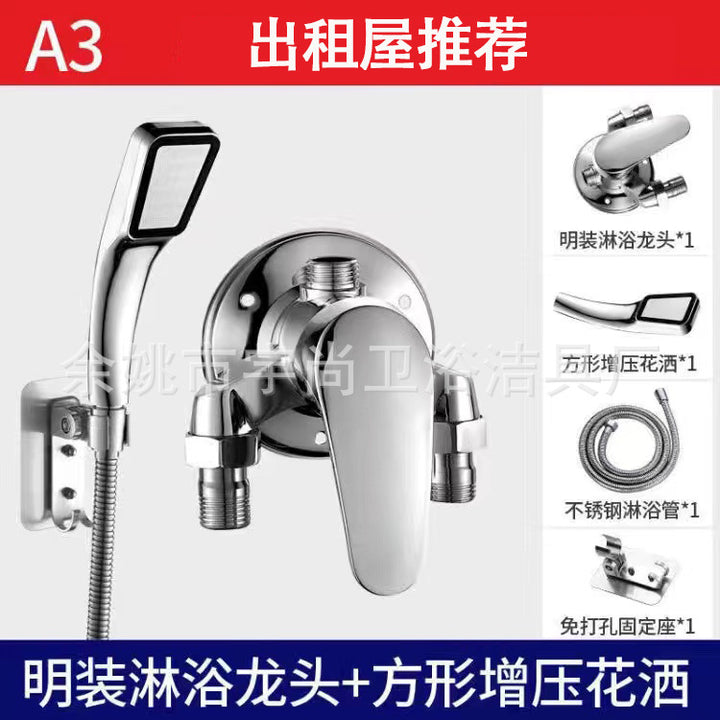 Surface mounted mixing valve, Surface installed water mixing valve + electroplating switch shower set, Surface-mounted water mixing valve + 300-hole rain shower set, Surface-mounted water mixing valve + Hans rain shower set, 1.5M double buckle pipe, No punching with hook base, Electroplating switch shower head, 300 hole shower head, HANS shower head, 304 stainless steel shower |