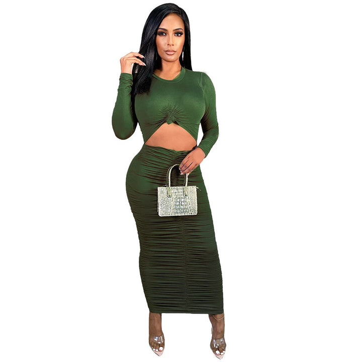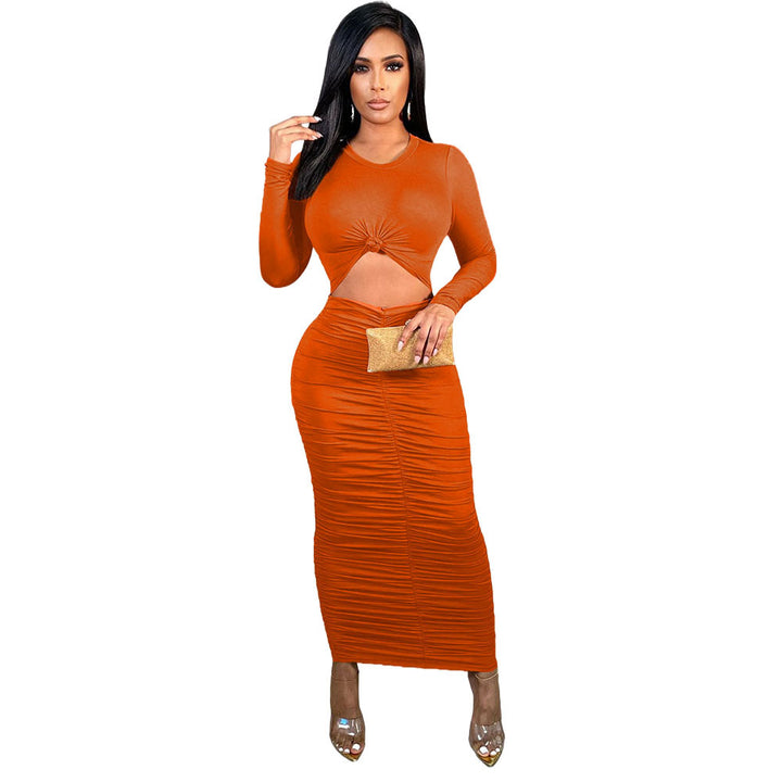 MM2145 supply Europe and America sexy autumn and winter women's clothing solid color pleated skirt long sleeve waist women's long dress