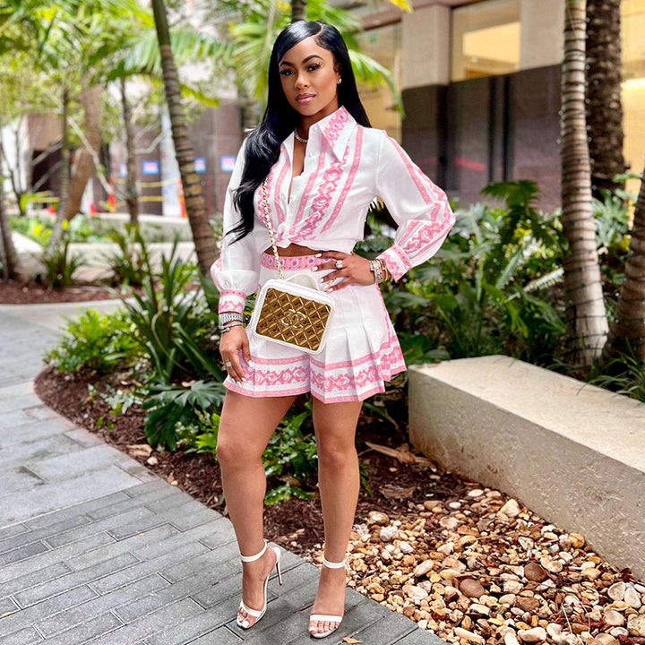 MM2175 European and American supply summer positioning printed women's shirt pleated pants set