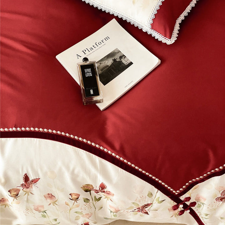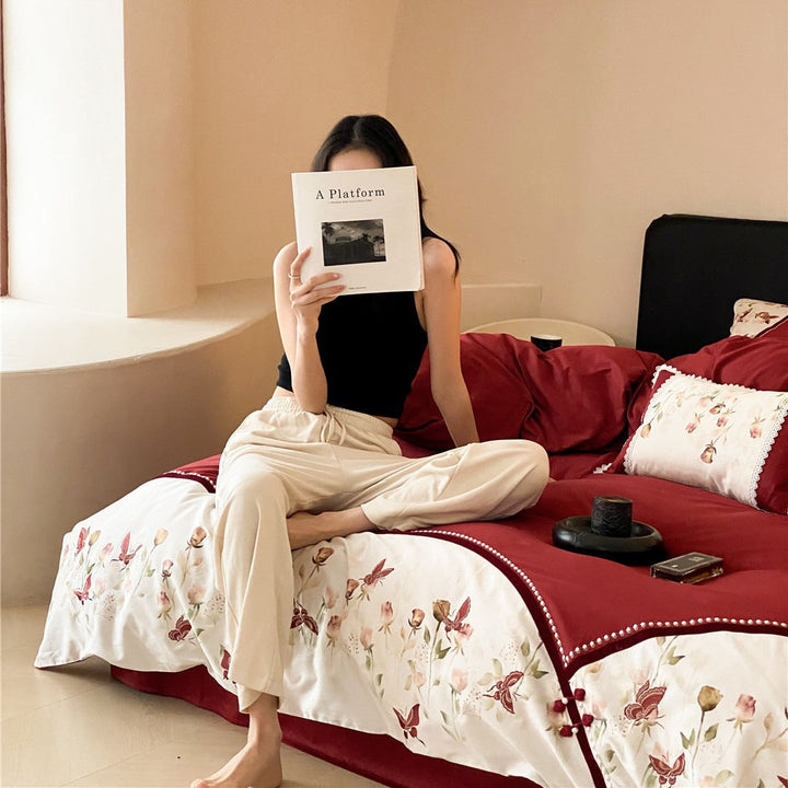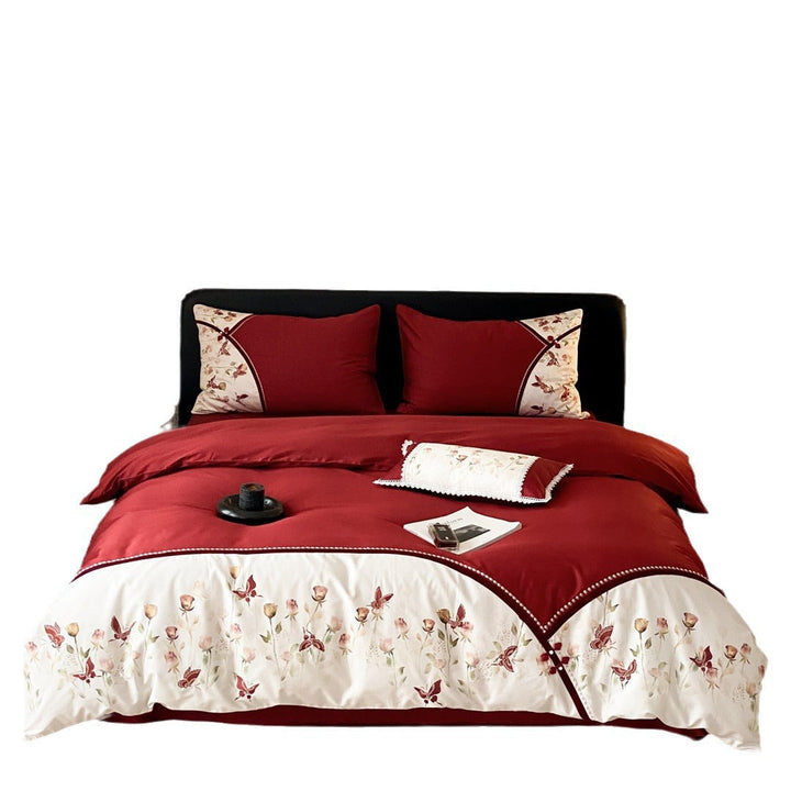 Modern new Chinese style rose embroidery big red bedding housewarming festive wedding daily pure cotton long-staple cotton four-piece set