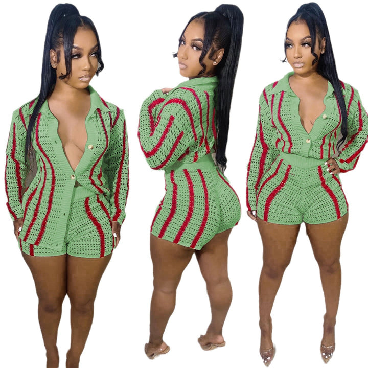 MY078 European and American high lapel, slim fit, cardigan, buttons, stripes, sweater two-piece set