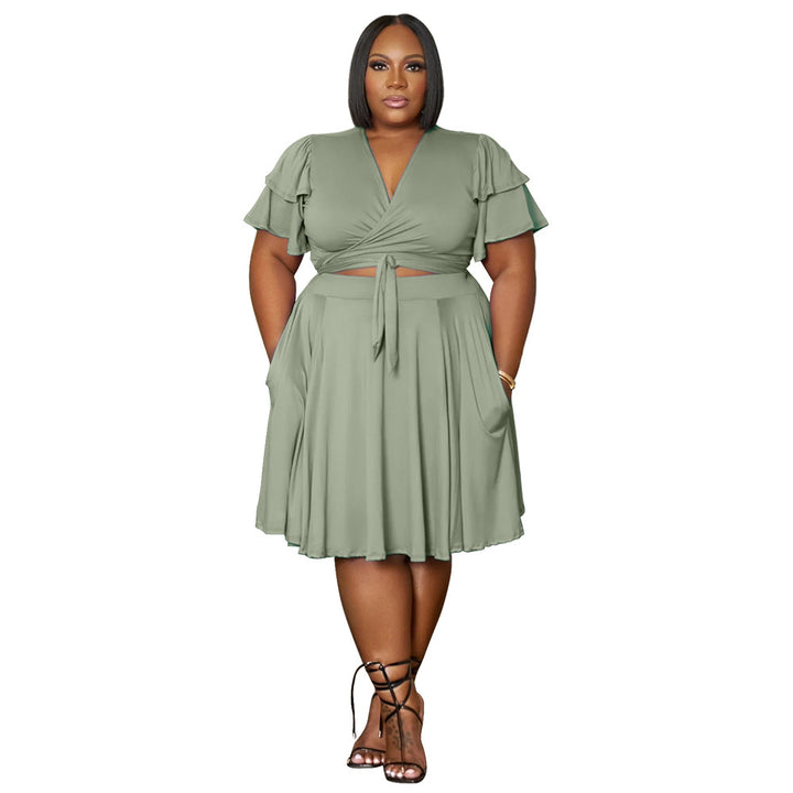 N7991 European and American women's clothing new lotus leaf sleeve lace-up short skirt pocket V-neck large size skirt set