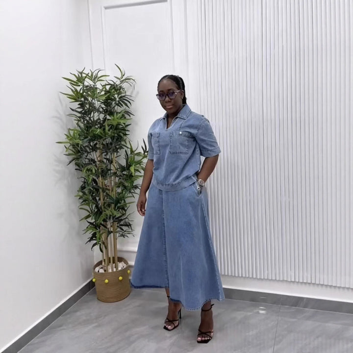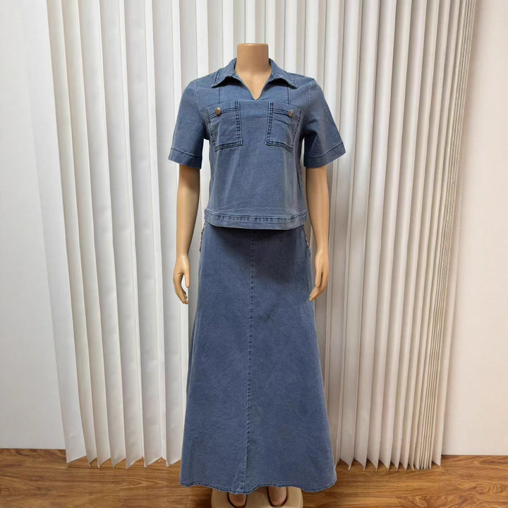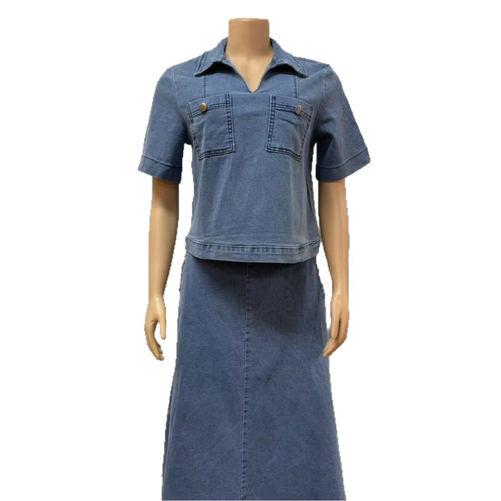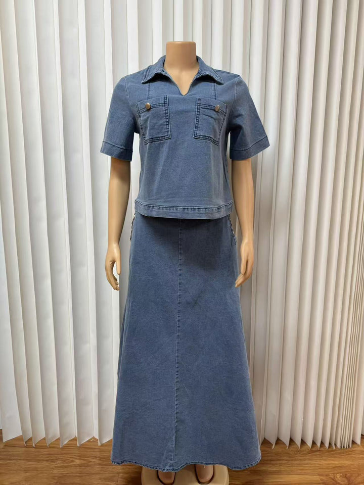 New casual denim suit, fashionable foreign denim skirt suit, Korean blue V-neck loose two-piece set