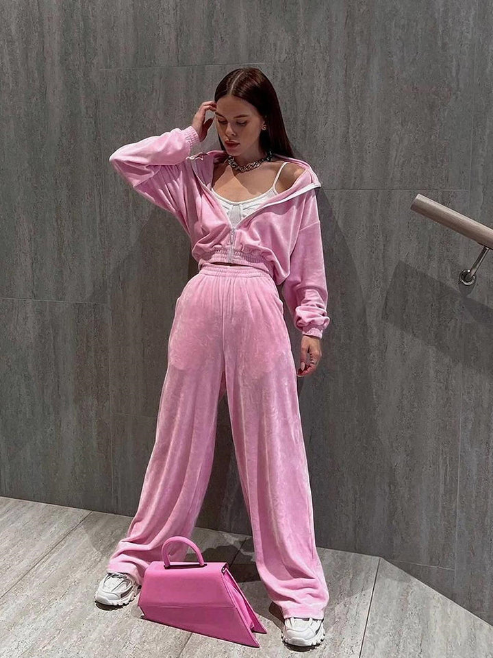 new European and American 2024 fashion women's clothing long-sleeved lapel zipper cardigan sweater fleece shirt trousers