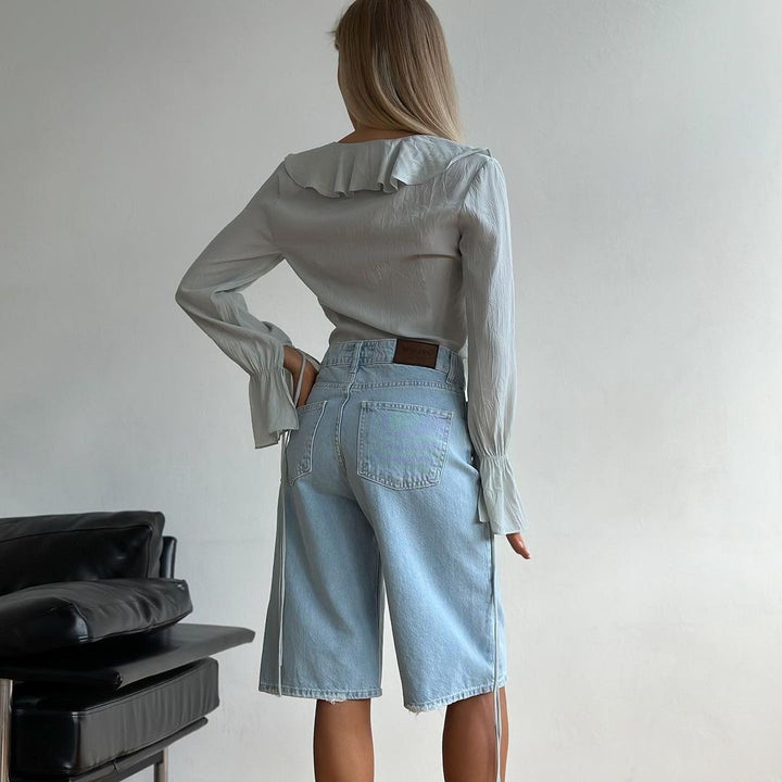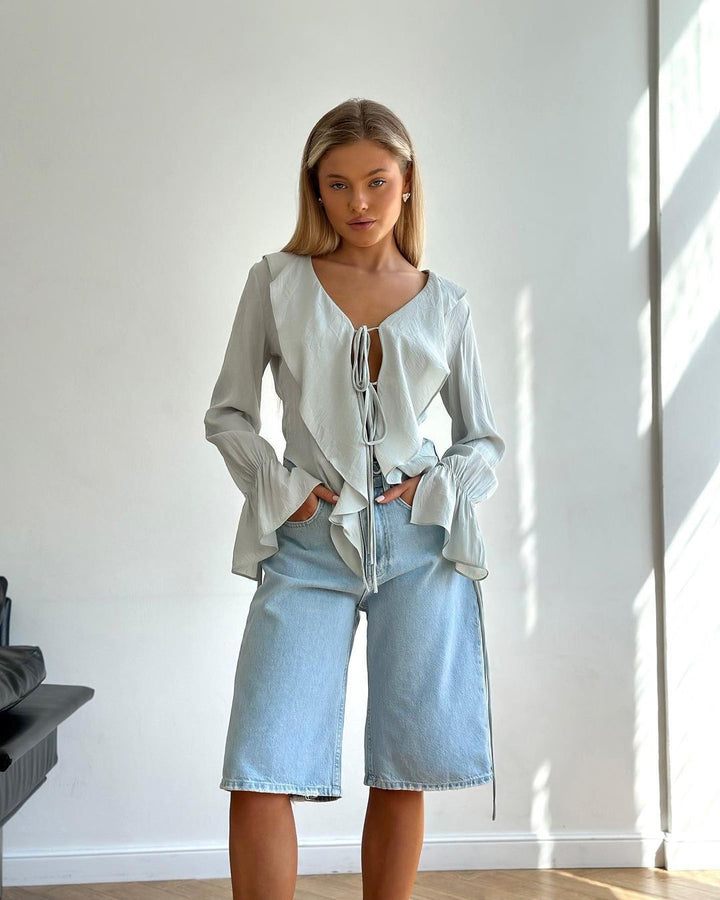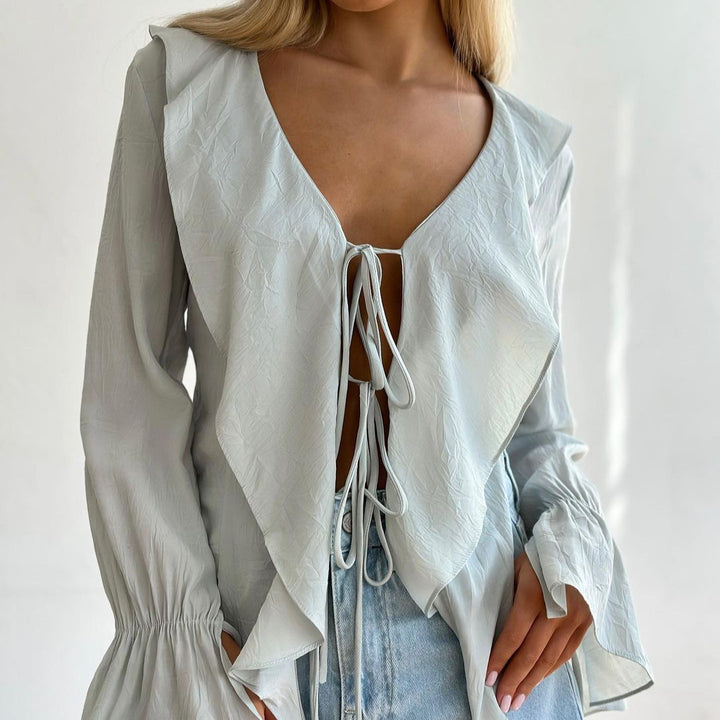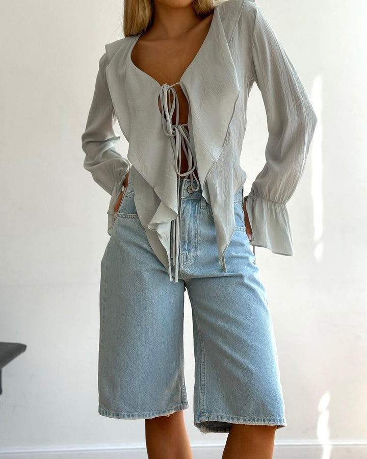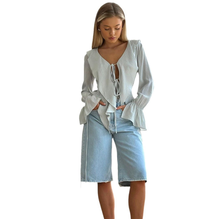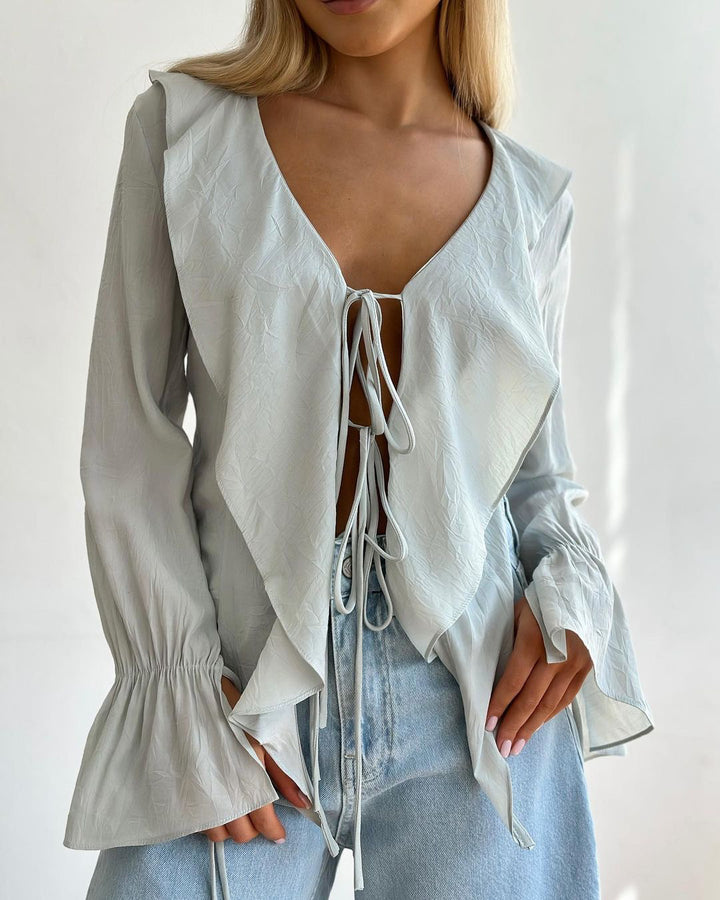 New European and American ins French lazy lace-up cardigan top autumn women's romantic petal sleeve short shirt