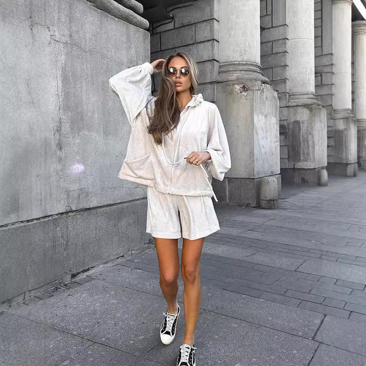 New European and American women's clothing street fashion long-sleeved hooded lace-up sports cardigan shorts two-piece suit women
