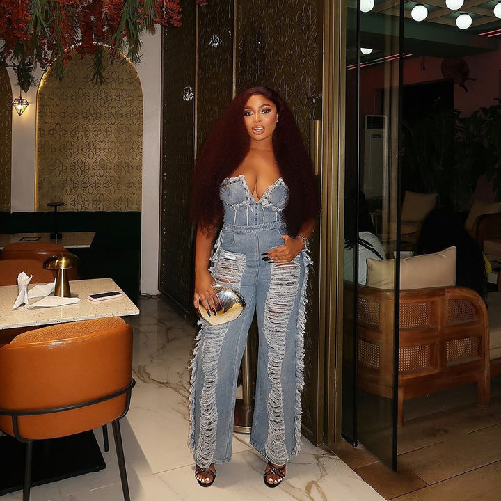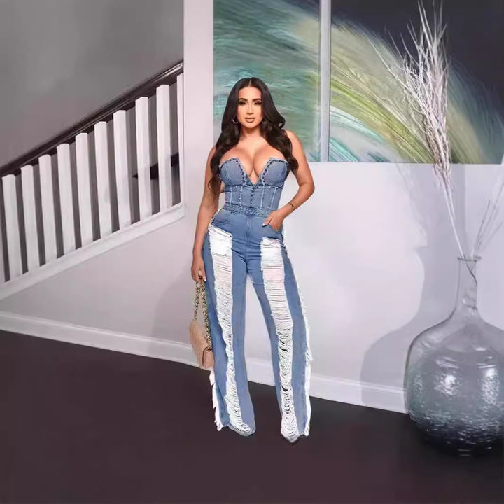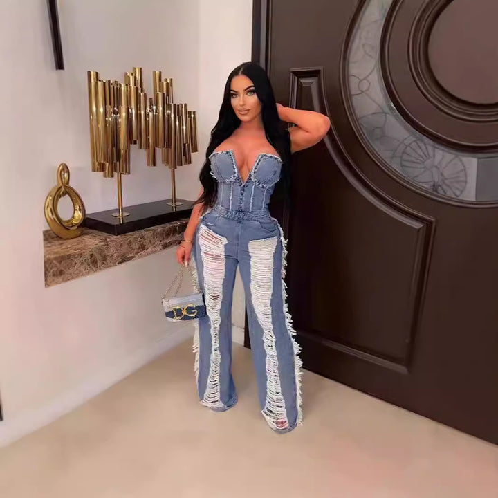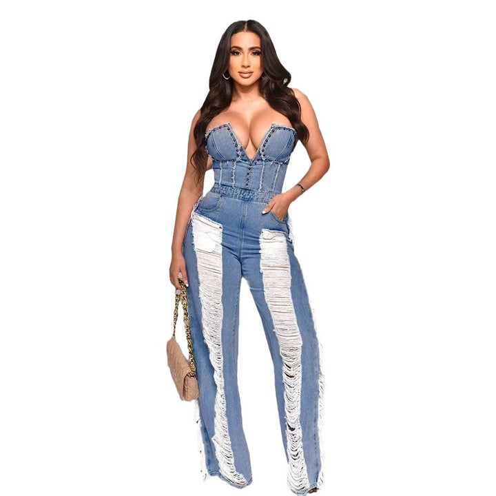 new fashion trend personalized tassel ripped nail drill washed denim jumpsuit trousers