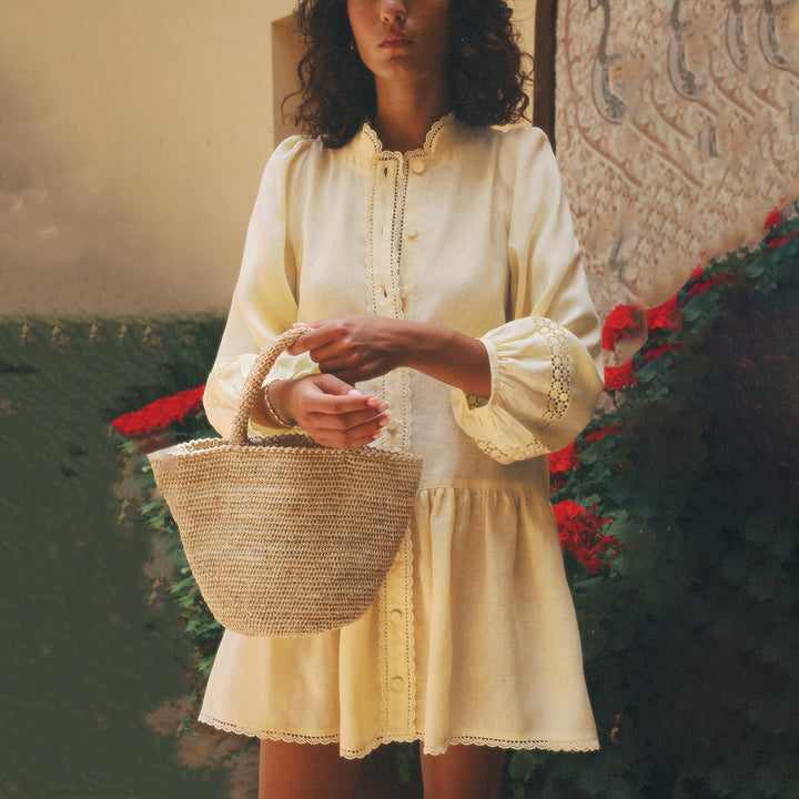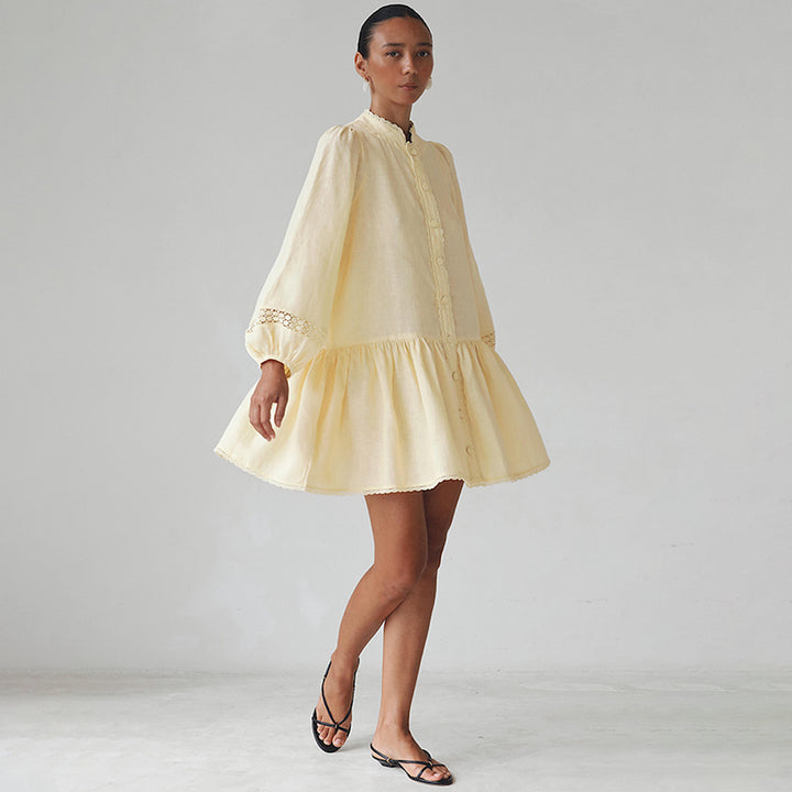 Yellow, White, Using cotton cloth + four-sided elastic fabric, shrinking pleated splicing lace design |