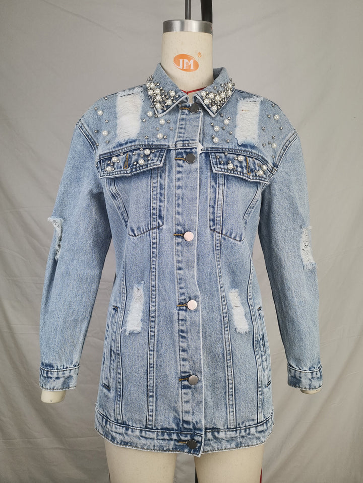 New models, denim shirts, European and American solid color ripped medium and long denim ...