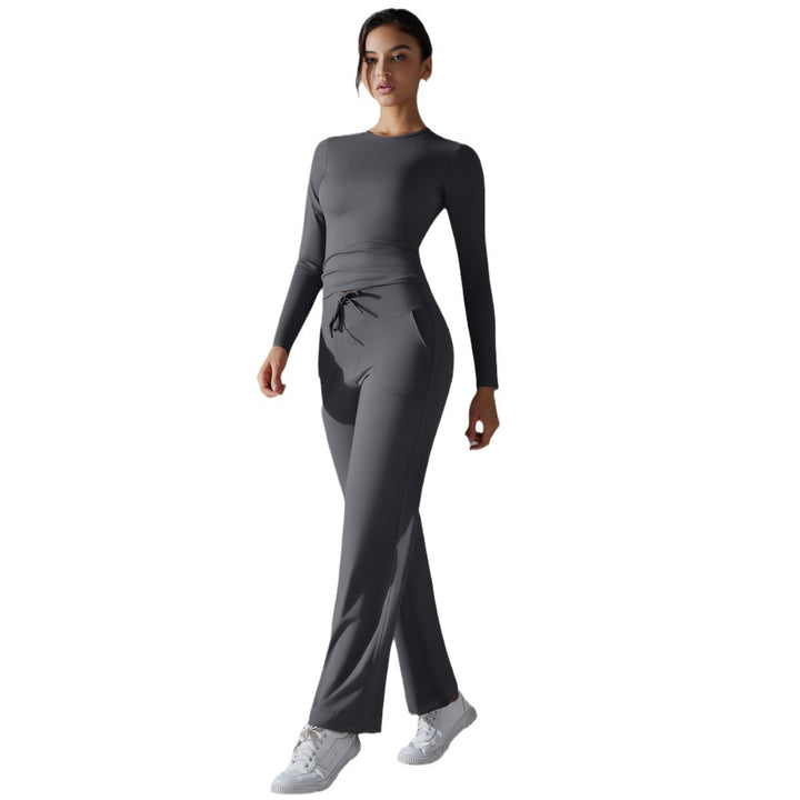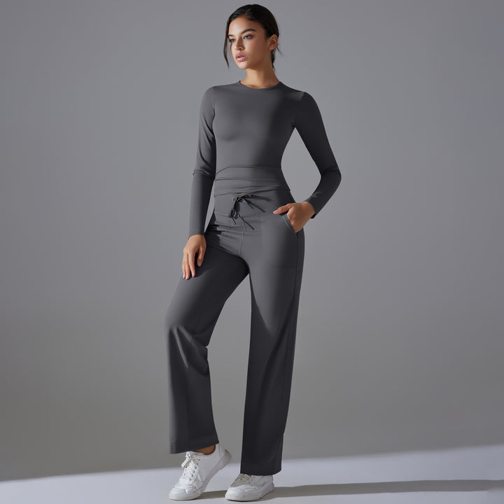 New nude skin-friendly long-sleeved yoga clothes high-intensity fitness clothes pocket running sports drawstring wide-leg pants set