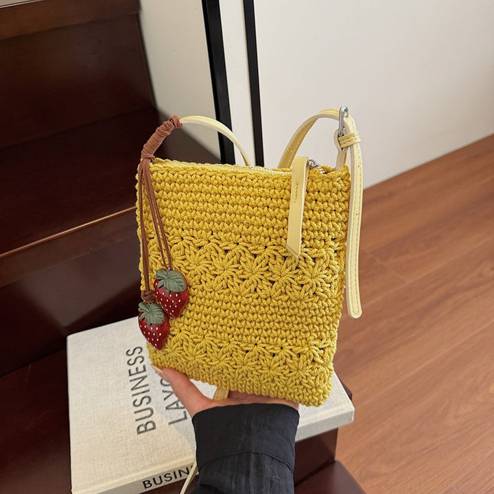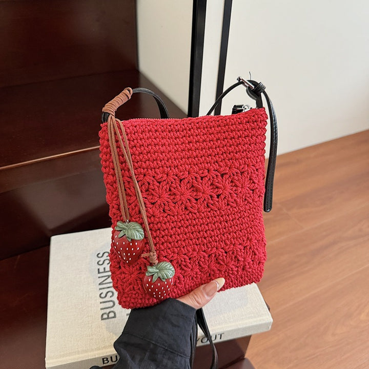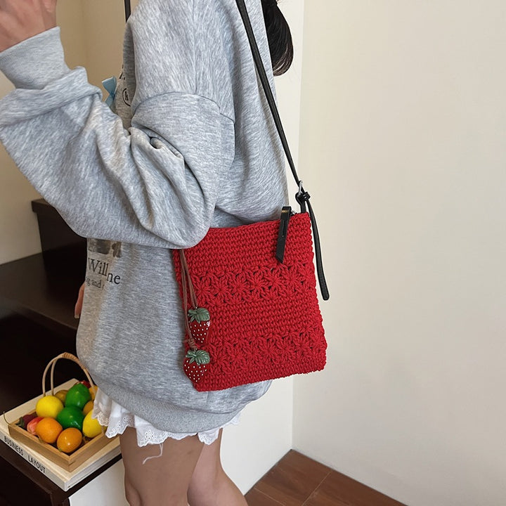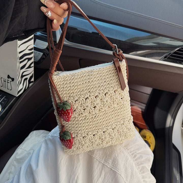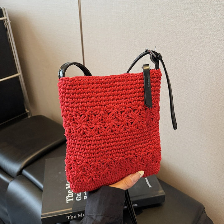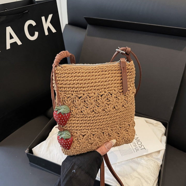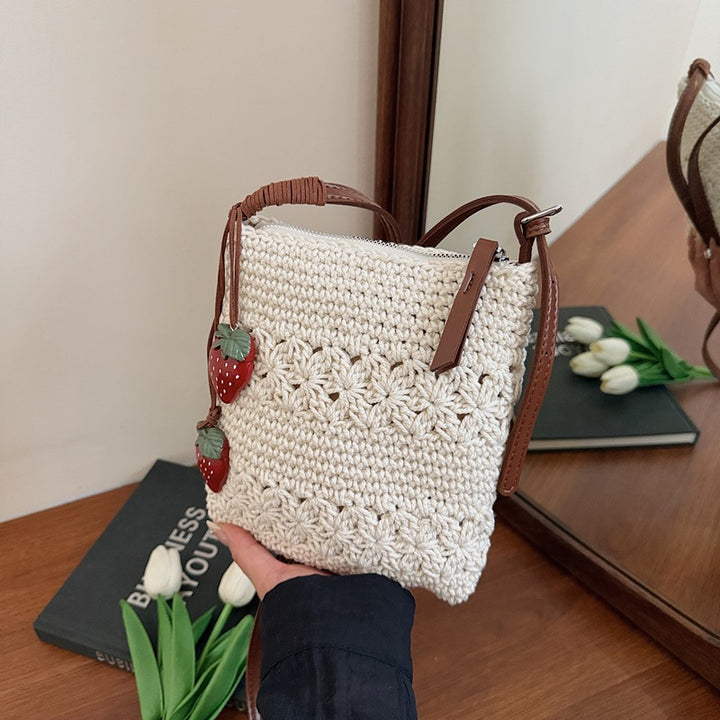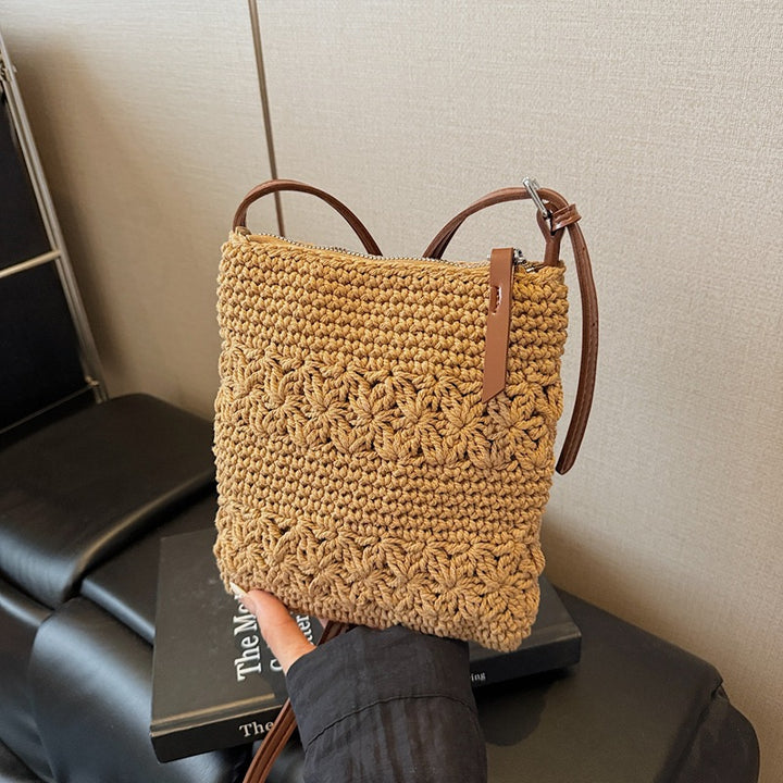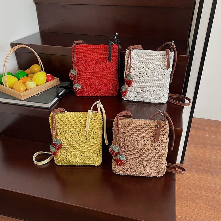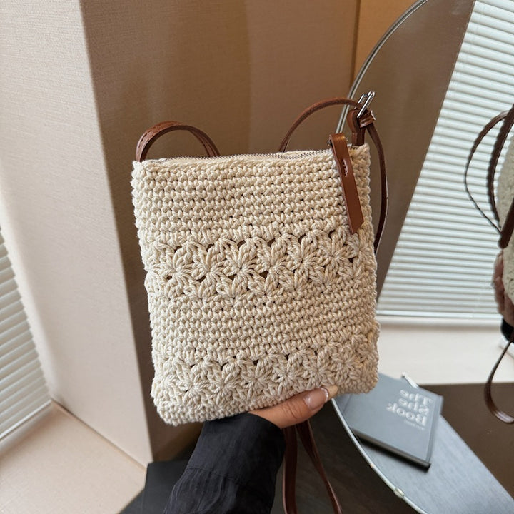 Oblique span hollow woven mobile phone bag small satchel women's 2025 new French retro vacation style shoulder bag bucket bag