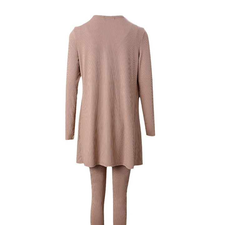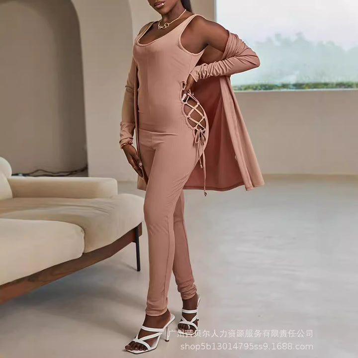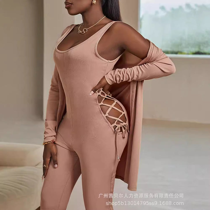 ODF2595 European and American women's clothing solid color cardigan + hollow strap slim jumpsuit (2-piece set)