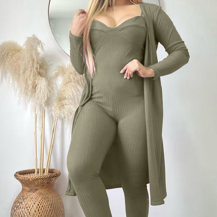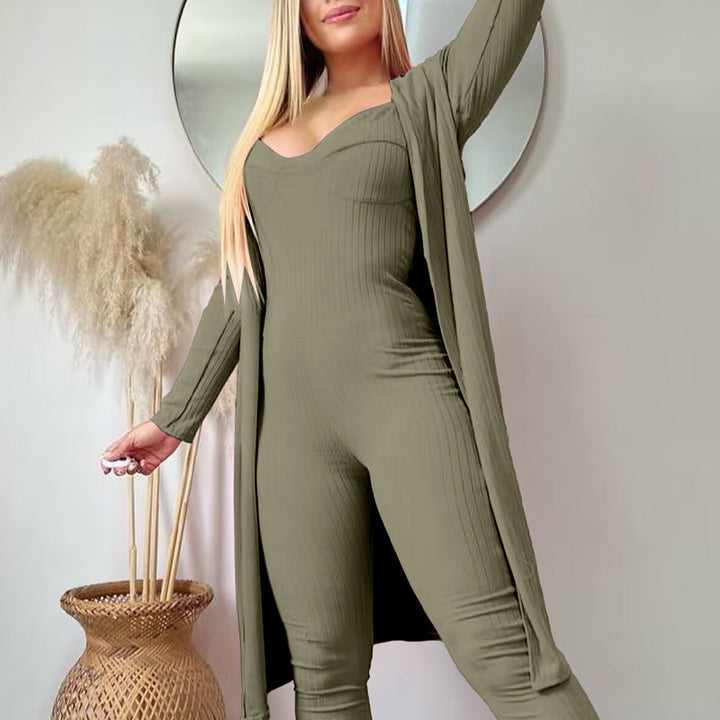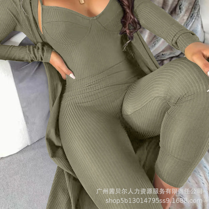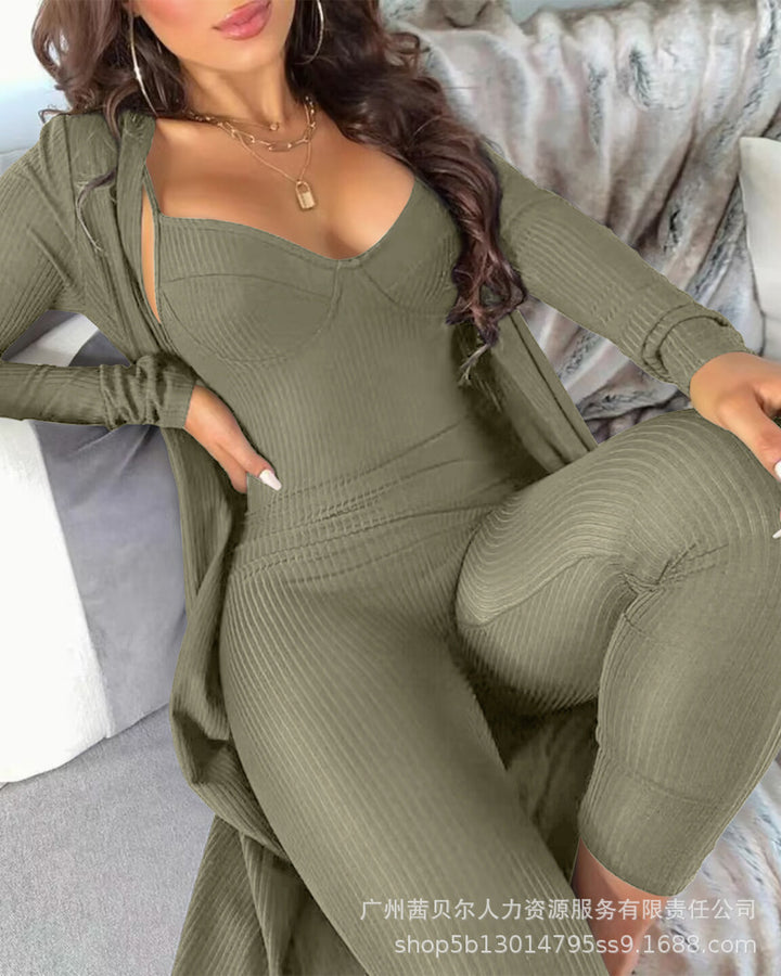 ODF4183 women's clothing European and American solid color pit strip v-neck suspender jumpsuit + cardigan 2-piece set