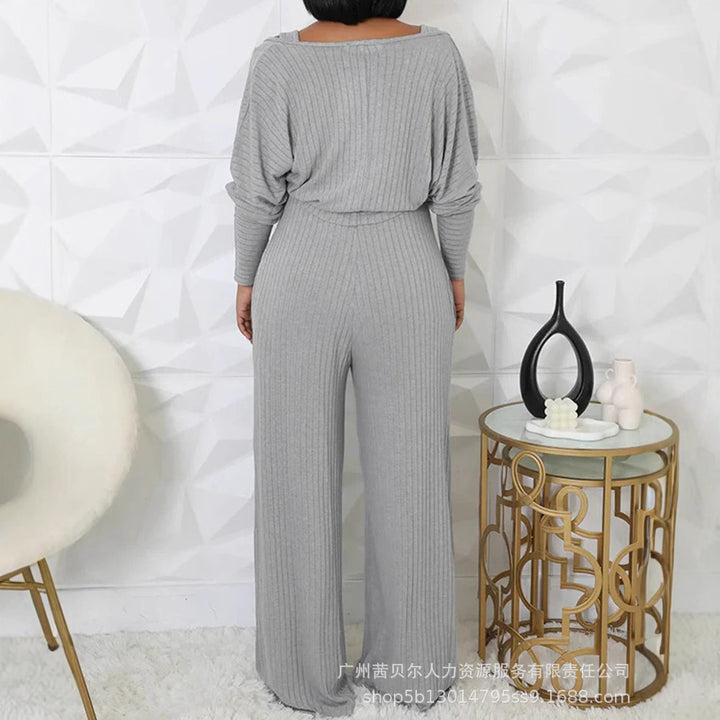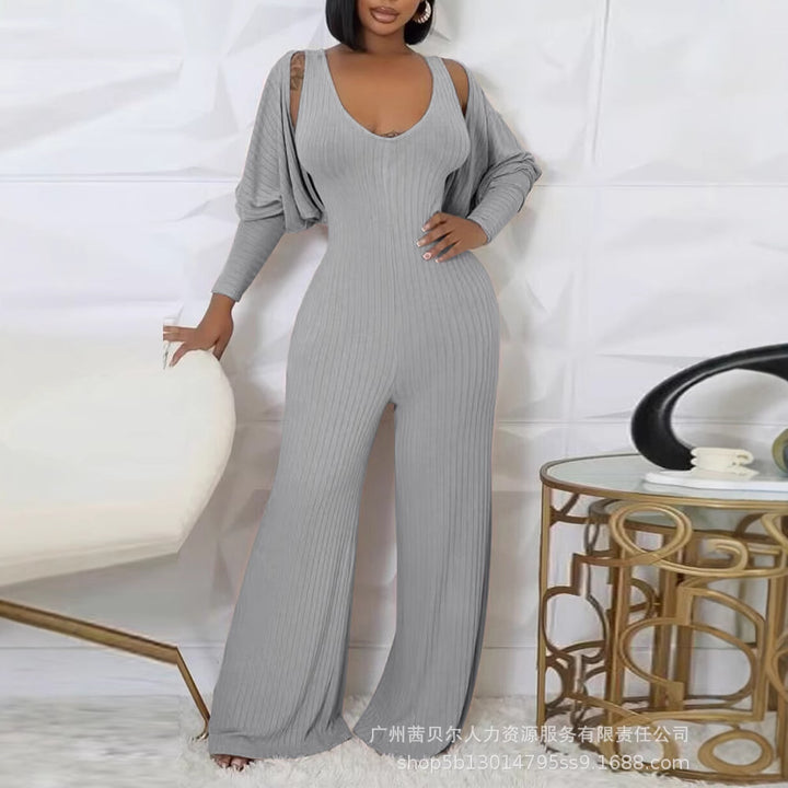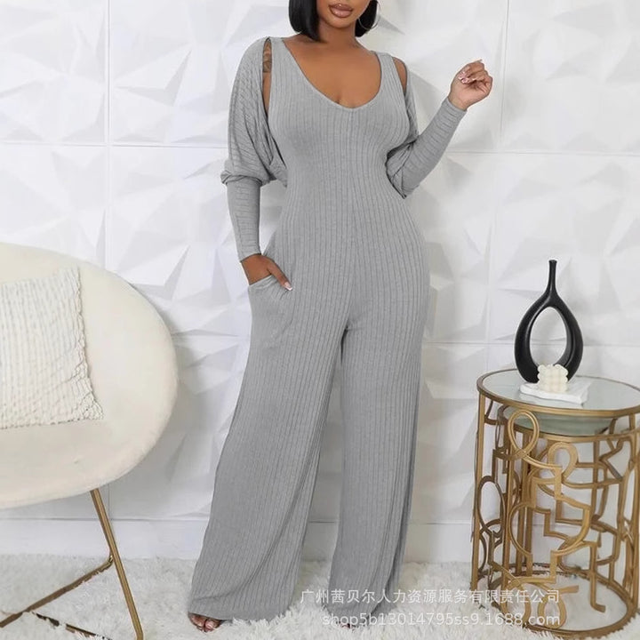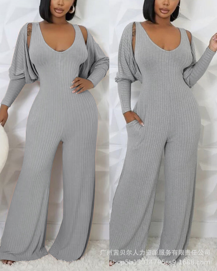 ODF4274 new Europe and the United States solid color abraded pit strip v-neck wide-leg wide-leg pants + leg sleeve cardigan