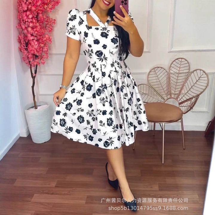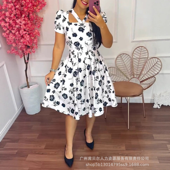 ODF4471 European and American floral print cross neckline bubble sleeve vacation casual dress