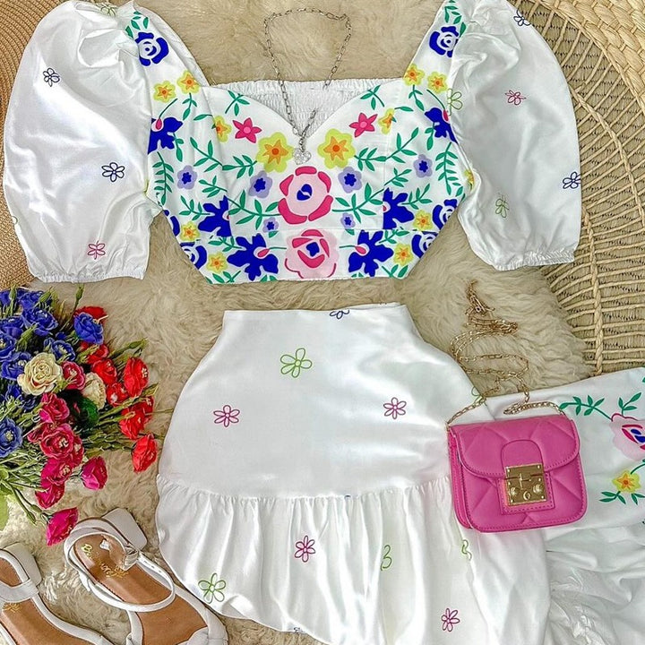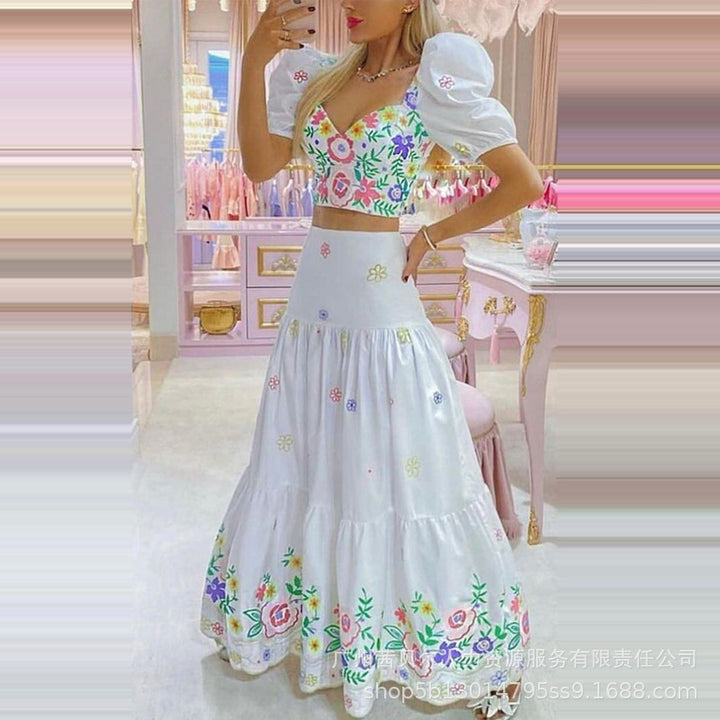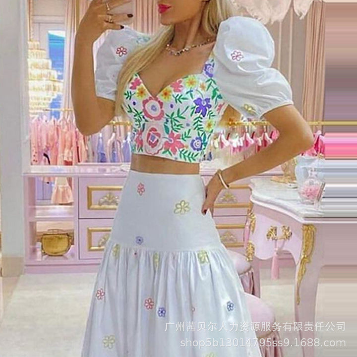 ODL2045 European and American women's clothing positioning printing bubble sleeve top + A pendulum printing skirt set 2-piece set)