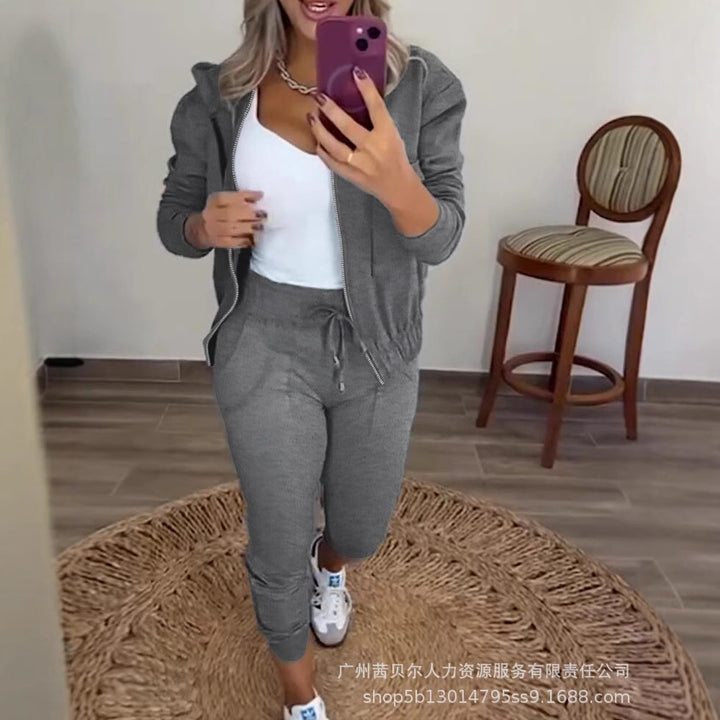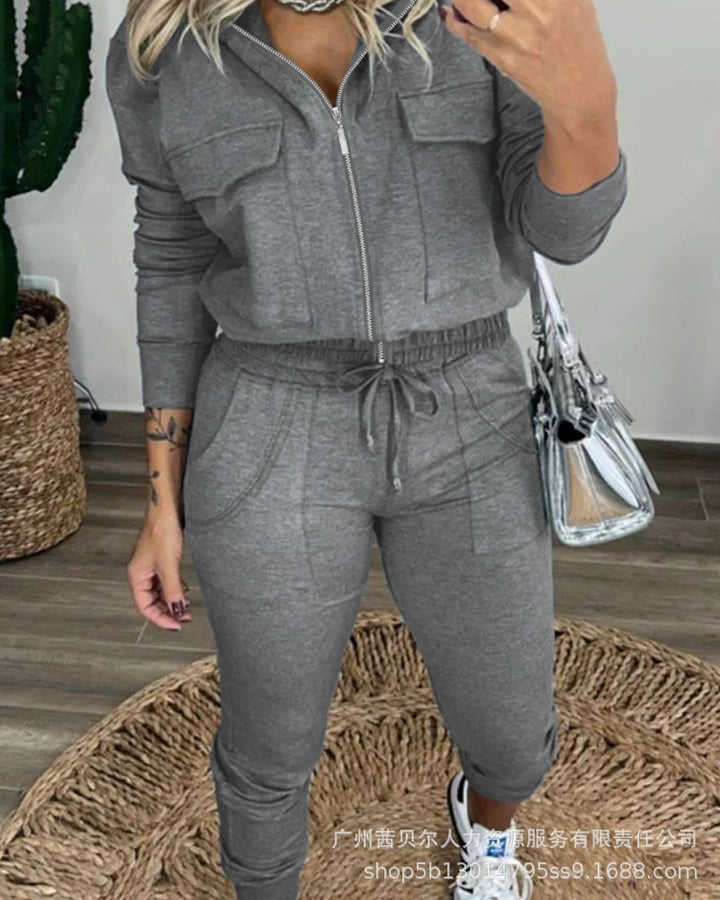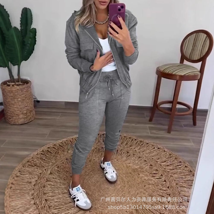 ODS5323 European and American solid color zipper jacket + elastic waist casual pants set (2-p...