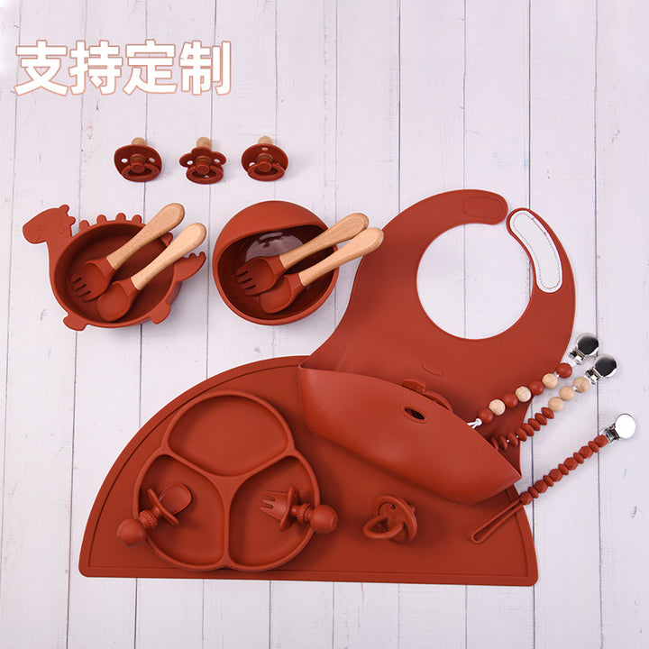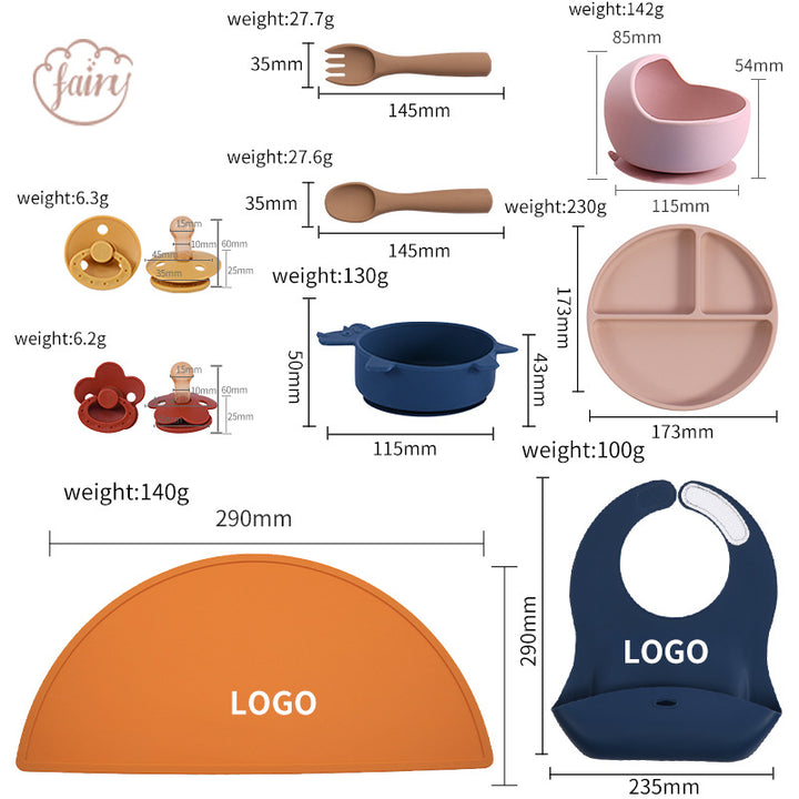 Semicircular placemat, Round plate, Flower plate, square plate, Simple bowl, Short handle fork and spoon, Round handle fork and spoon, Wooden handle fork and spoon, Universal bib |