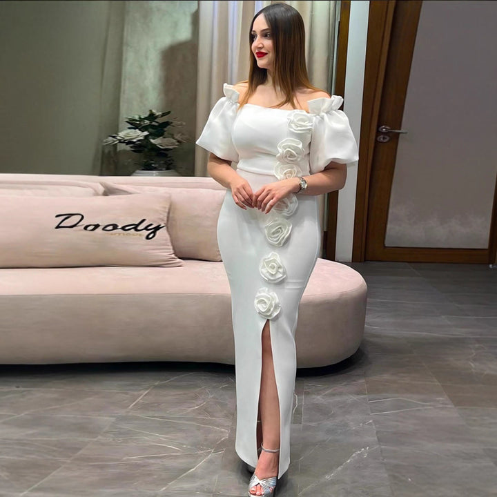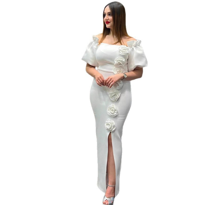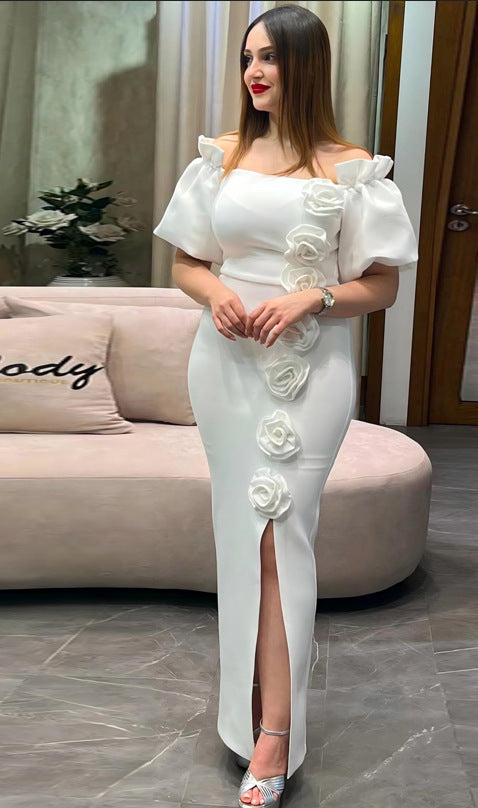One-word shoulder sexy bubble sleeve dress, three-dimensional flower slim fit elegant split party evening dress dresses