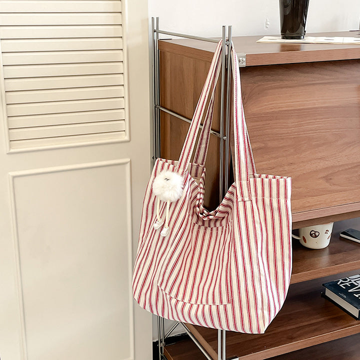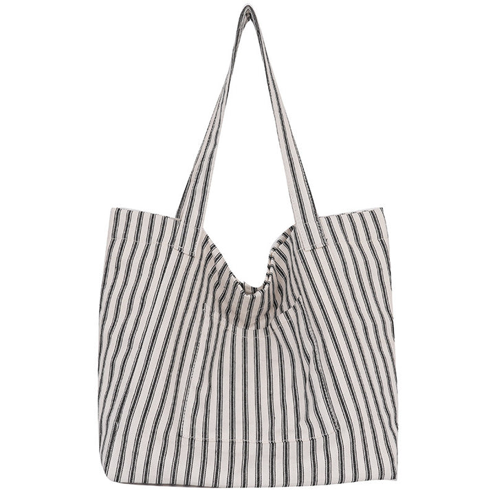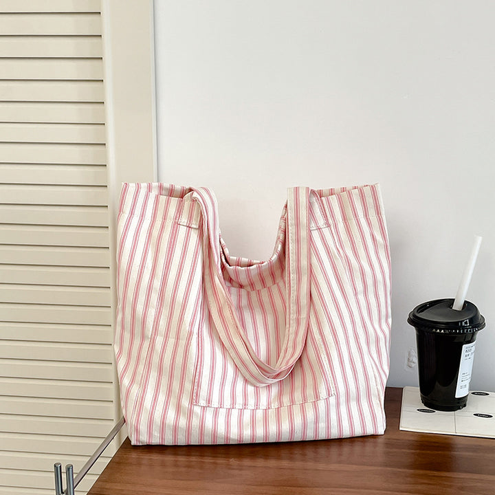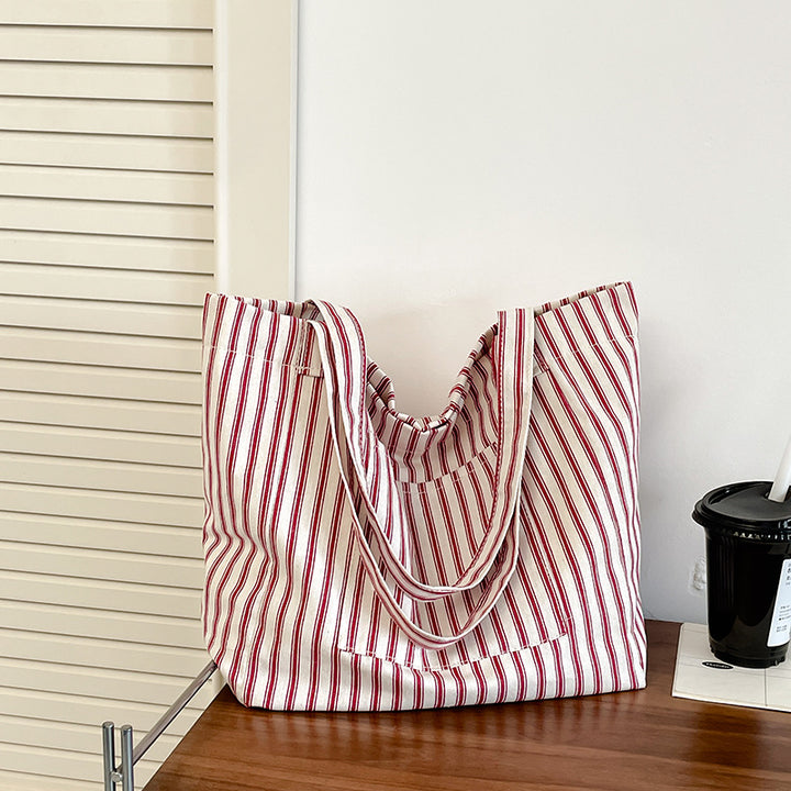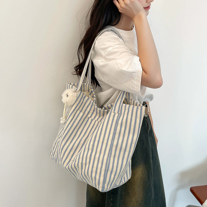 Outer single striped canvas bag women's large capacity 2025 summer new casual shoulder bag college student class tote bag